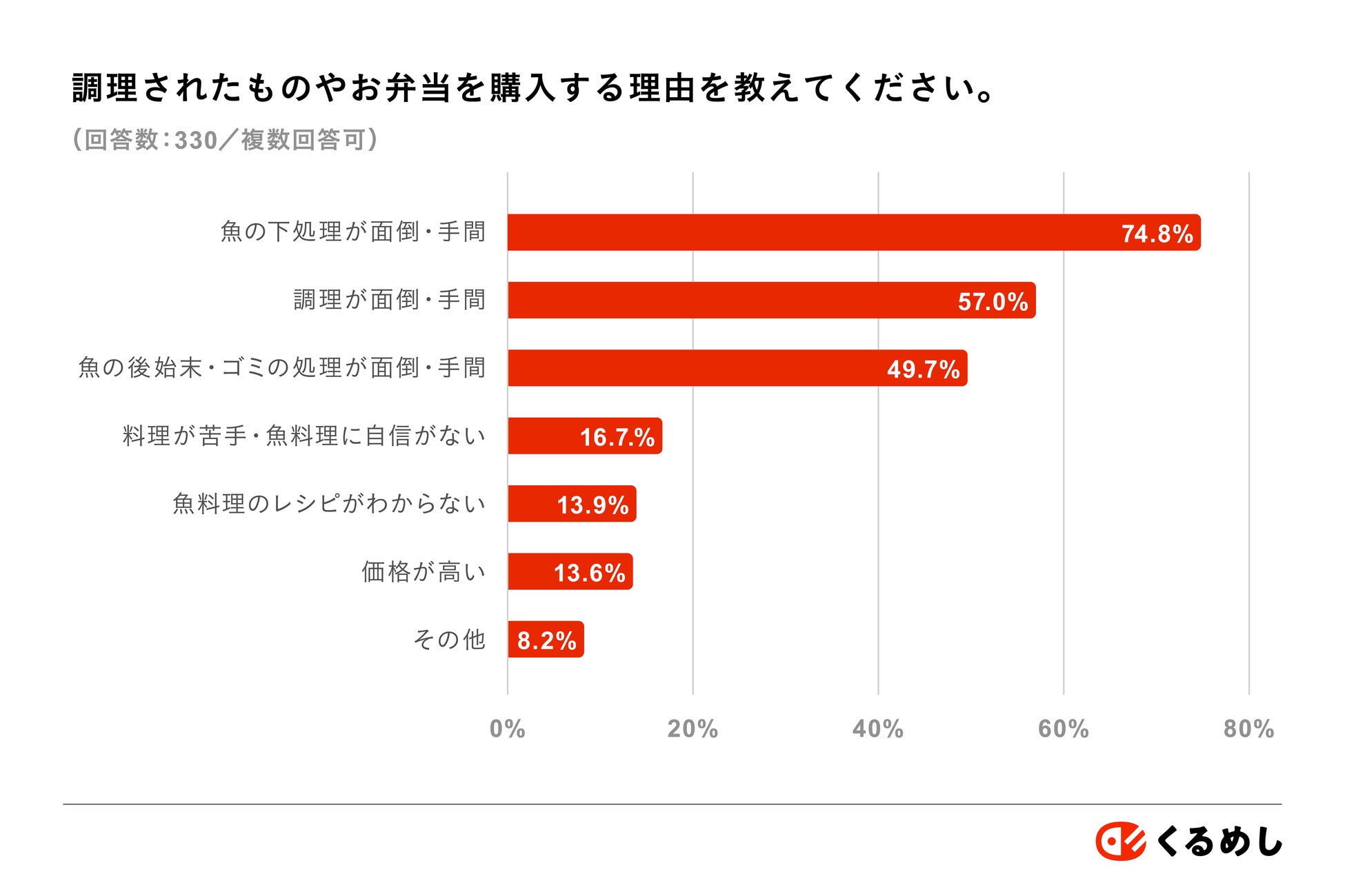また、調理されたものやお弁当を購入する理由として「調理された魚料理を購入して食べる理由を教えてください。(複数回答)」と聞いたところ、「魚の下処理が面倒・手間(74.8%)」「調理が面倒・手間(57.0%)」「魚の後始末・ごみ処理が面倒・手間(49.7%)」が回答として多く挙げられました。その他、自由回答では、「料理をする時間がない」「時間の節約のため」などの回答もみられました。