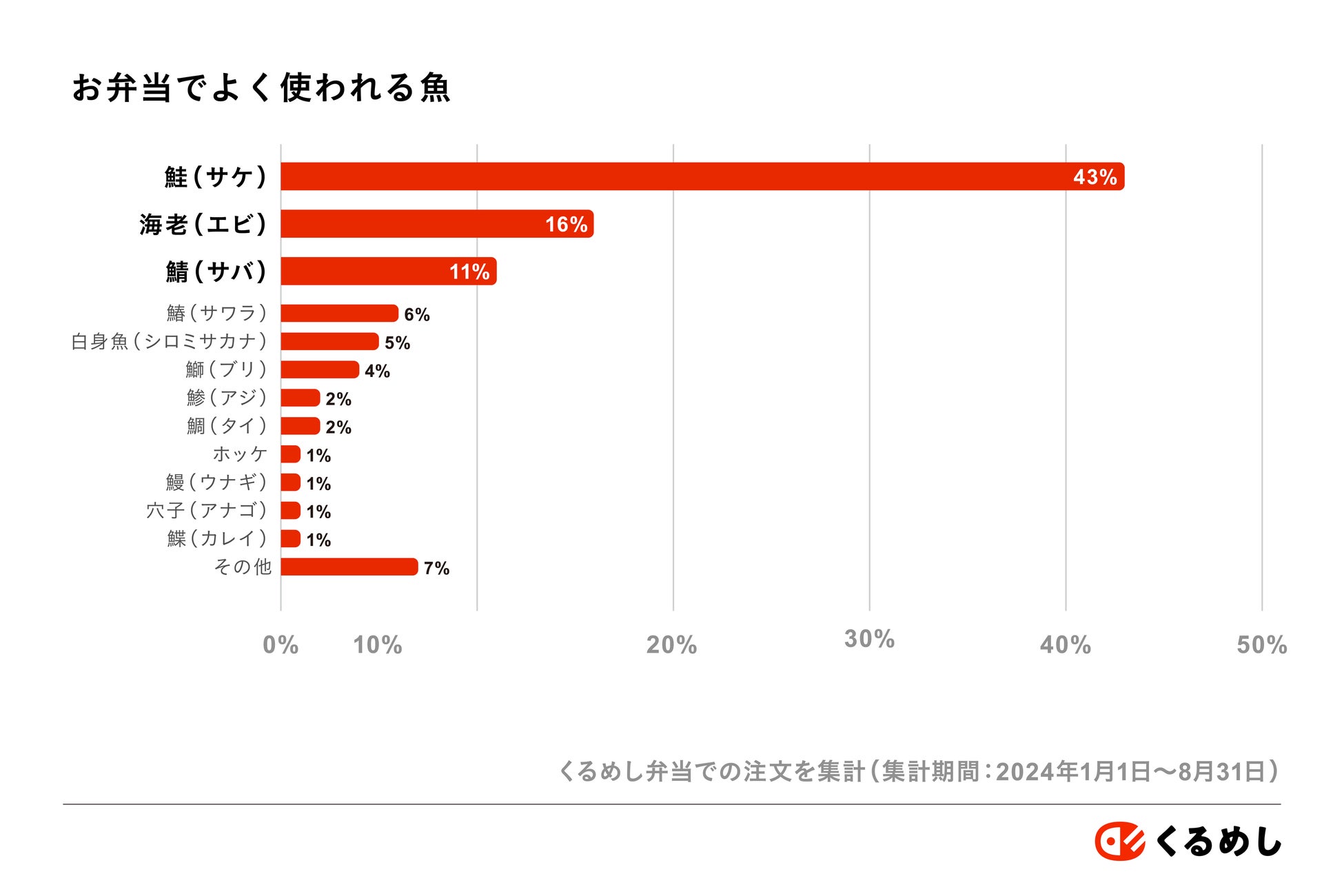 当社サービスで、今年1月から8月までに注文されたお弁当を集計したところ、実際に魚類のお弁当に使われている魚の種類で多いのは、「鮭(サケ)」「海老(エビ)」「鯖(サバ)」でした。また、調理方法としては、73%が「焼き」という結果でした。(集計期間:2024年1月1日~8月31日)