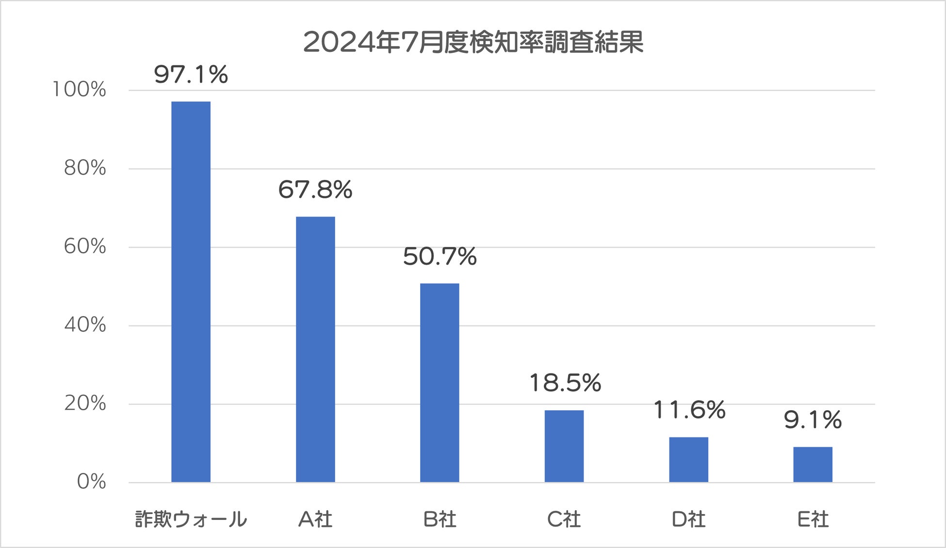 詐欺ウォールを開発・提供するBBソフトサービスでは、公的機関などとの連携によって収集した詐欺サイトURLを利用し、定期的に詐欺サイトの検知率調査を行っています。2024年7月の詐欺ウォールによる詐欺サイト検知率は97.1%と他社と比較し高い結果となりました。