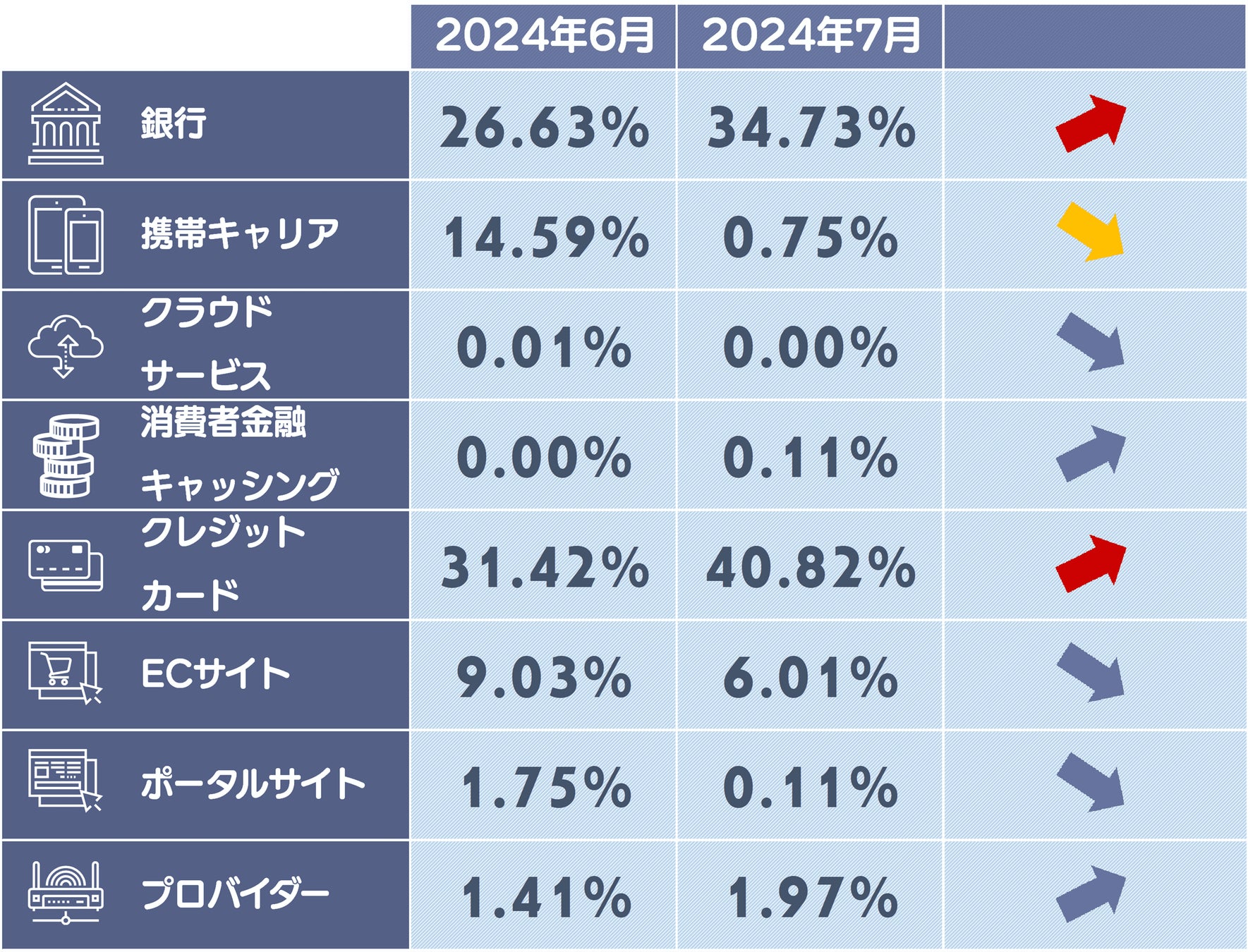 7月度はクレジットカード・銀行の構成比が上昇しています。クレジットカードは三井住友カード、銀行は大手3行のフィッシングサイトが影響して構成比が増加しています。携帯キャリアはNTT docomoの報告数が減少したことにより構成比が減少しています。