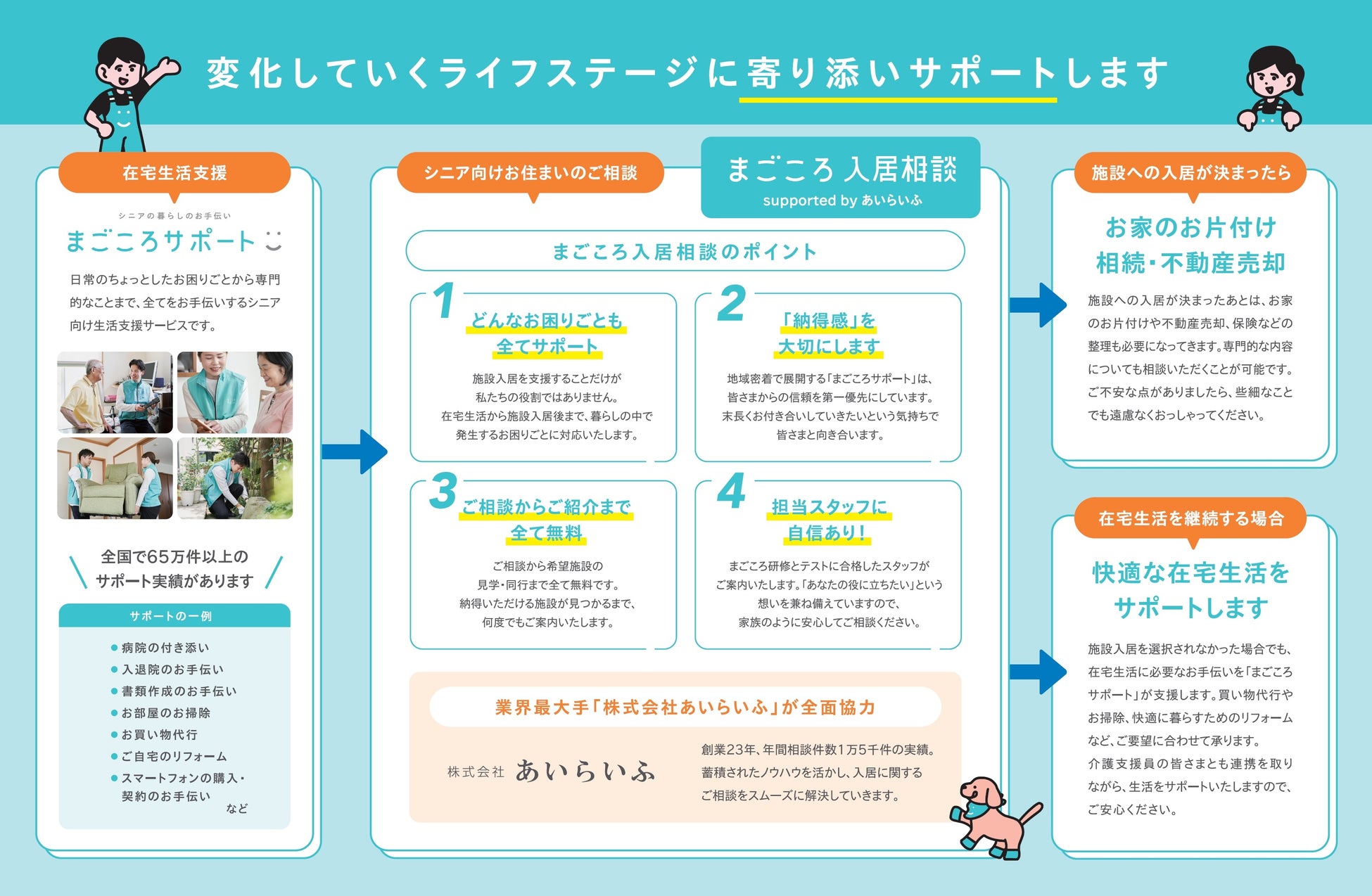 あいらいふでは、20年以上にわたり、「あいらいふ⼊居相談室」として⾸都圏を中⼼に有料⽼人ホーム⼊居相談事業を展開しております。あいらいふに⼊居相談をいただいた方のうち実際に⼊居に至る方は約3割であり、残り7割の方は様々な事情で在宅⽣活を継続しています。そこで、あいらいふでは、サービスの⼿の⾏き届かなかった7割の方々にも対応するべく、昨年9月、「まごころサポート」へFC加盟し、東京・吉祥寺に「まごころサポート東京武蔵野あいらいふ店」を開設いたしました。店舗内には「あいらいふ⼊居相談室」も併設され、在宅⽣活から施設介護までトータルでシニアライフをサポートしております。