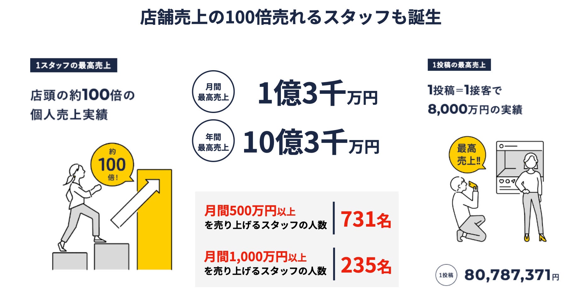 利用スタッフのうち700名以上が月間500万円以上を売上げ、235名が月間1000万円以上を売り上げるなど、店舗スタッフの活躍の場に寄与しています。