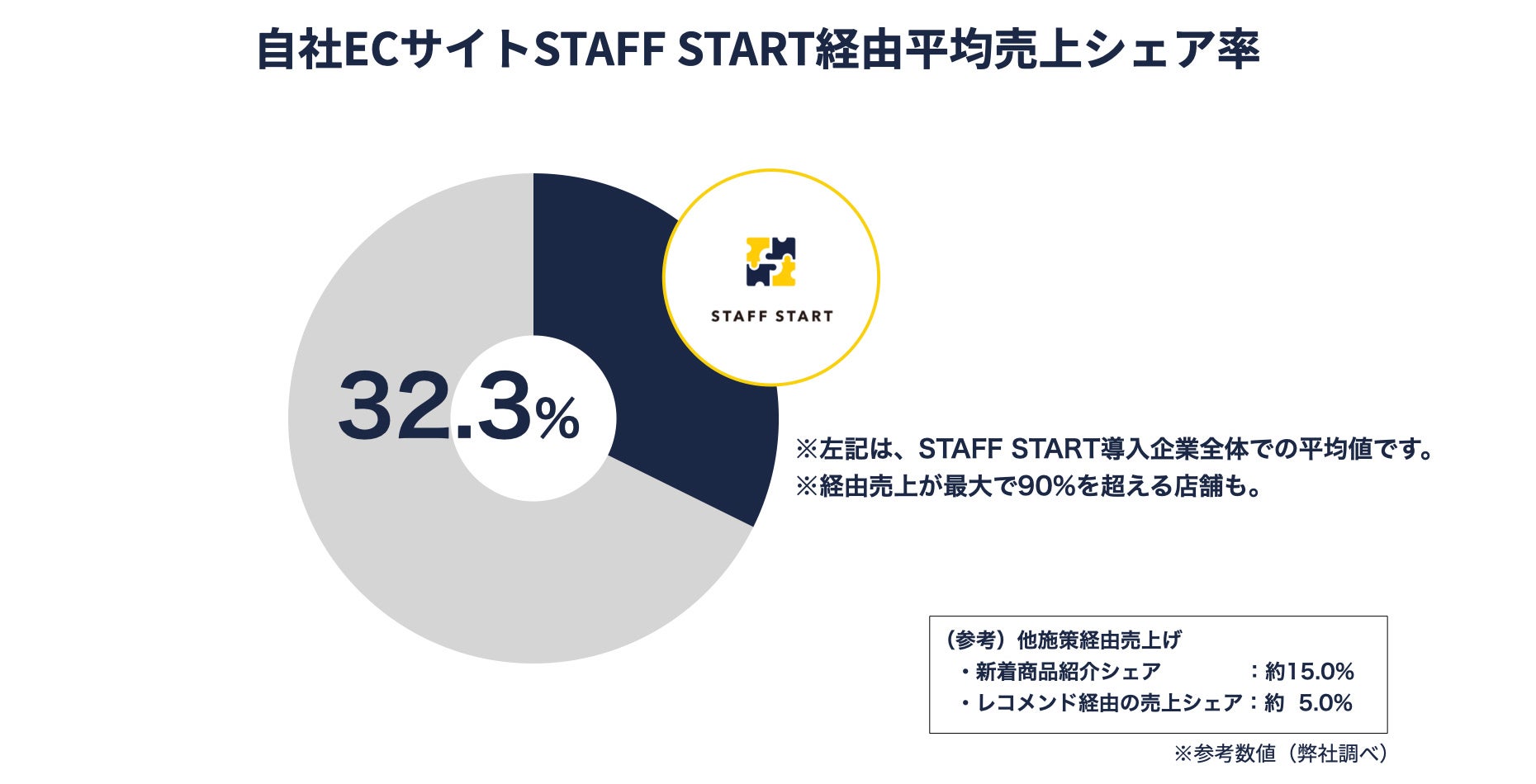 2022年8月には、STAFF STARTは2100超のブランドに導入され、スタッフアカウント数は18万7000を突破しました。導入いただいているブランドのECサイト内でのSTAFF START経由の売上シェア率は平均32.3%と、約5%と言われている「商品レコメンド」での売上シェアの6倍以上。