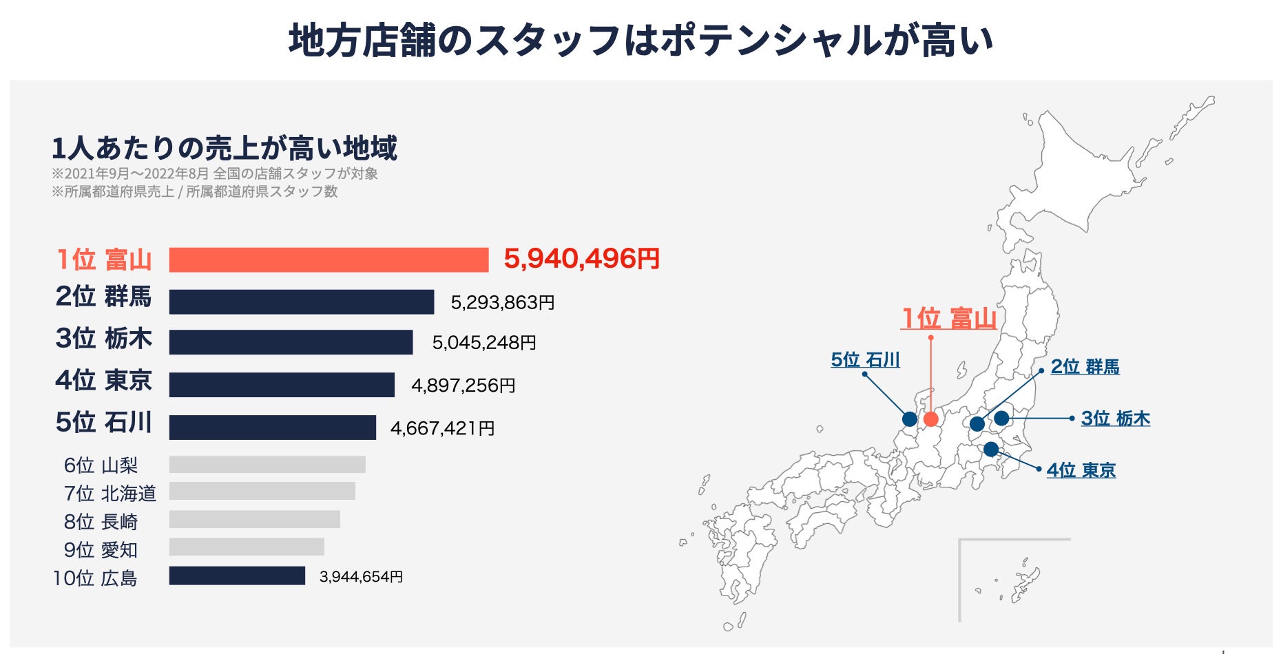 2021年9月〜2022年8月の調査では、STAFF START経由のスタッフ1人あたりの売上が高い地域は富山県が1位という結果になりました。4位の東京を100万円以上上回り、ロケーションに依存することなく全ての優秀なスタッフが全国で活躍が可能になりました。