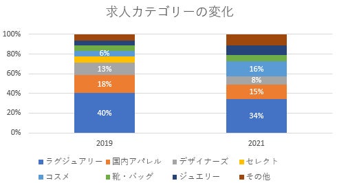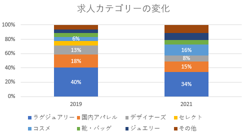 求人カテゴリーを比較すると、ラグジュアリー、国内アパレル、デザイナーズブランドの割合は2019年の水準まで回復しつつあります。国内アパレルはアウトレットモールを中心に販売員求人が、デザイナーズは販売員に加え従来はあまりなかった事務や専門職の需要が、それぞれ増加したことが要因だと考えられます。またECとの親和性が高く市場への期待も大きいコスメに関してはSNS人材を中心に求人比率が大きく高まりました。
