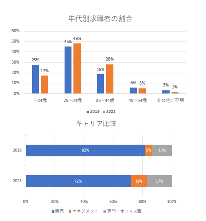 求職者の年代比較では24歳以下の割合が大きく減少し、逆に35~44歳の割合が大きく増加。キャリア比較を見ても、店頭販売員が減少した一方でマネジメント職や専門職の割合は増加していることから、現場でのマネジメント経験が豊富な人材や即戦力となるスペシャリストの採用が重視されていると言えます。これは昨今の業界全体の不振を経て、実店舗の価値見直しやSNSをはじめとしたデジタル面の戦略強化が急激に進んでいることが背景にあります。