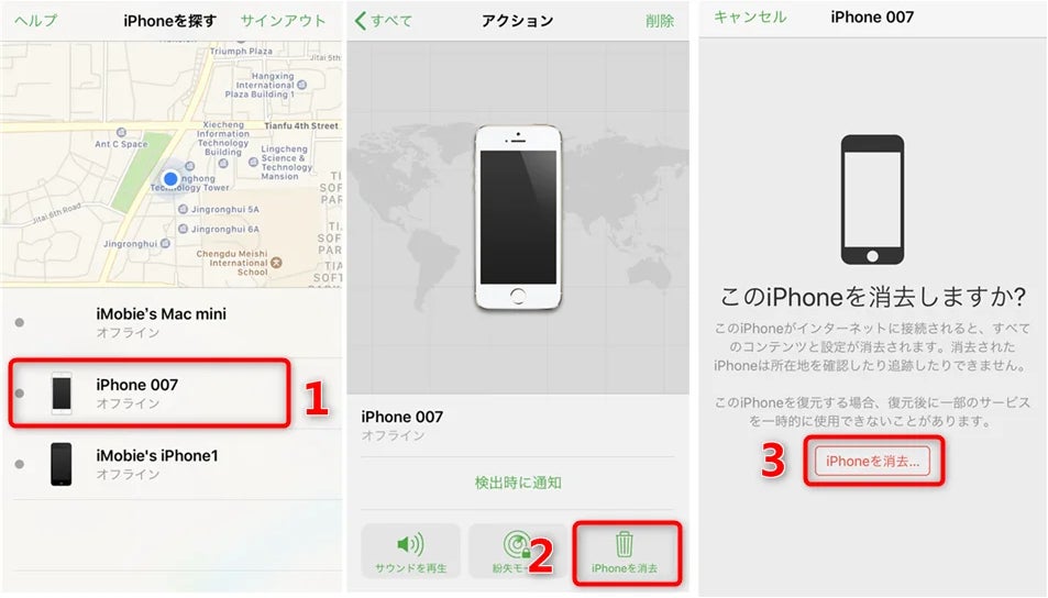 ほかのiOS端末で「探す」アプリを起動、Apple IDをサインインし、初期化したいiPhoneを選択して「消去」を実行します。