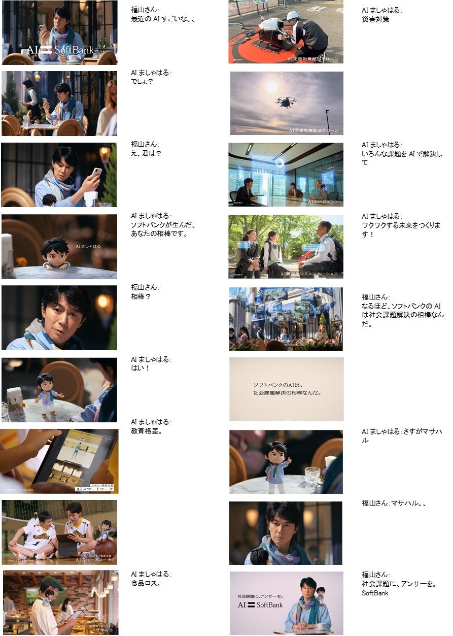 本テレビCMは、福山さんとソフトバンクが共に創り上げた新たな相棒「AIましゃはる」との出会いを描いています。「AIましゃはる」は、自然災害や教育格差、食品ロスといった多様な社会課題を解決し、ワクワクする未来を切り拓いていくソフトバンクのAI(人工知能)の可能性を紹介します。驚きつつも少しずつ心を開いていく福山さんの姿にもご注目ください。さらに、「AI宣言篇」に加えて、今後も「AIましゃはる」が活躍する新たなCMを順次公開予定です。
