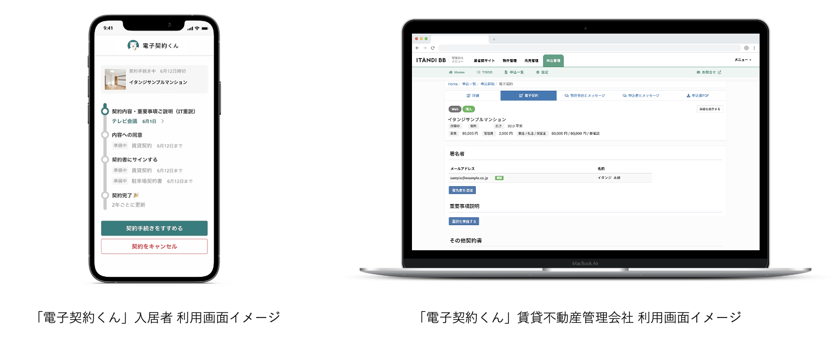 イタンジの不動産賃貸業務のDXサービス群「ITANDI BB +(イタンジビービー プラス)」の不動産関連電子契約システム「電子契約くん」は、賃貸住宅の入退去に関する契約締結をオンラインで完結できるシステムです。