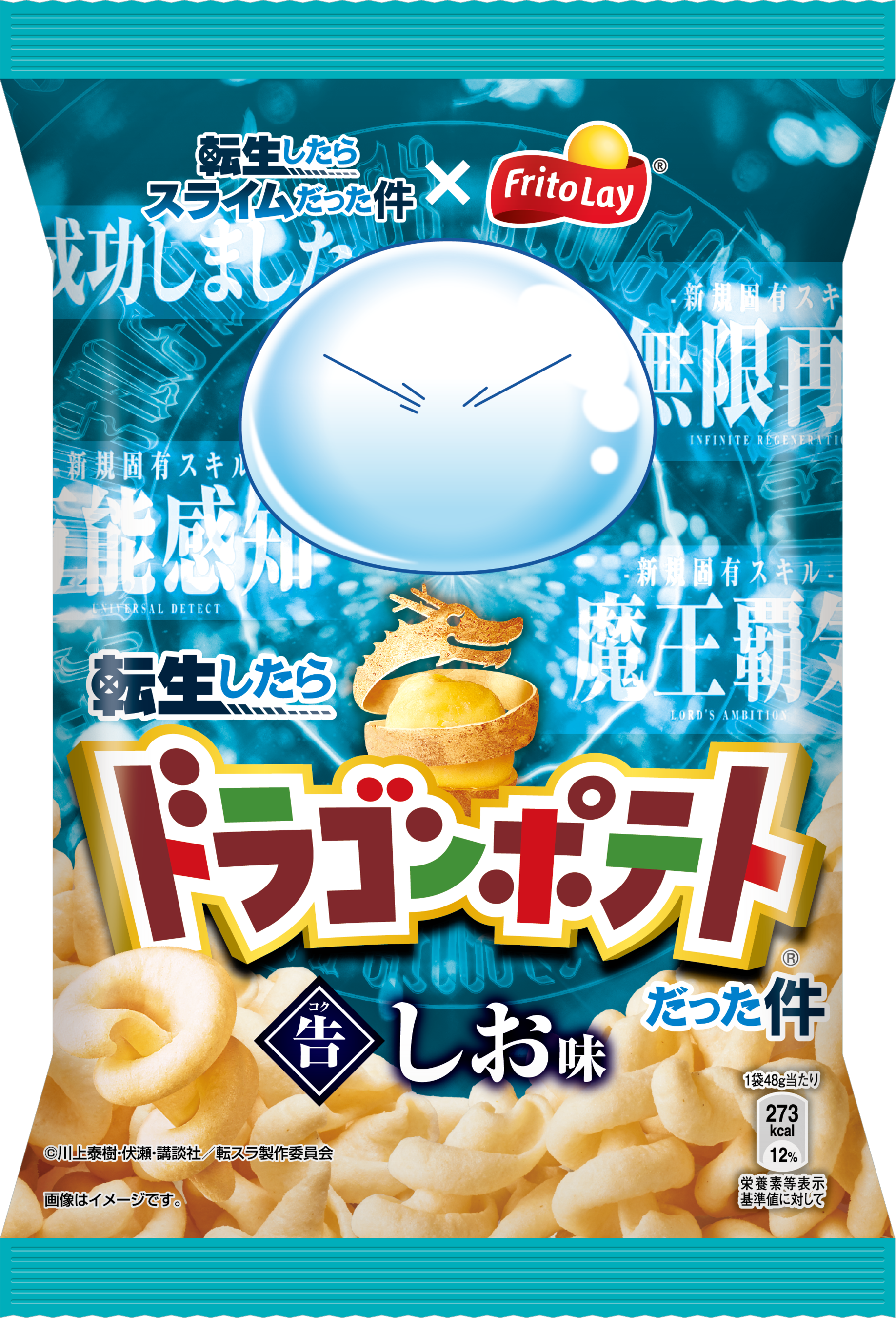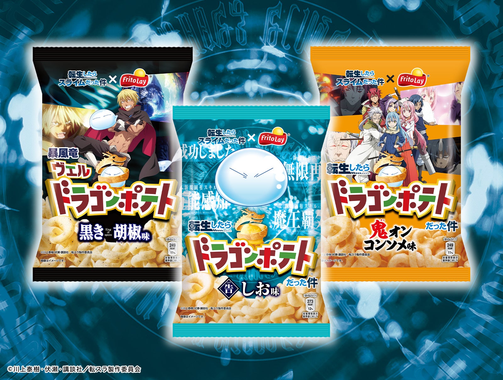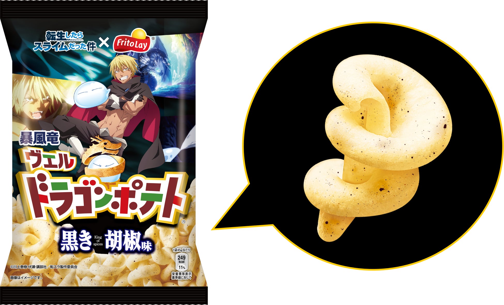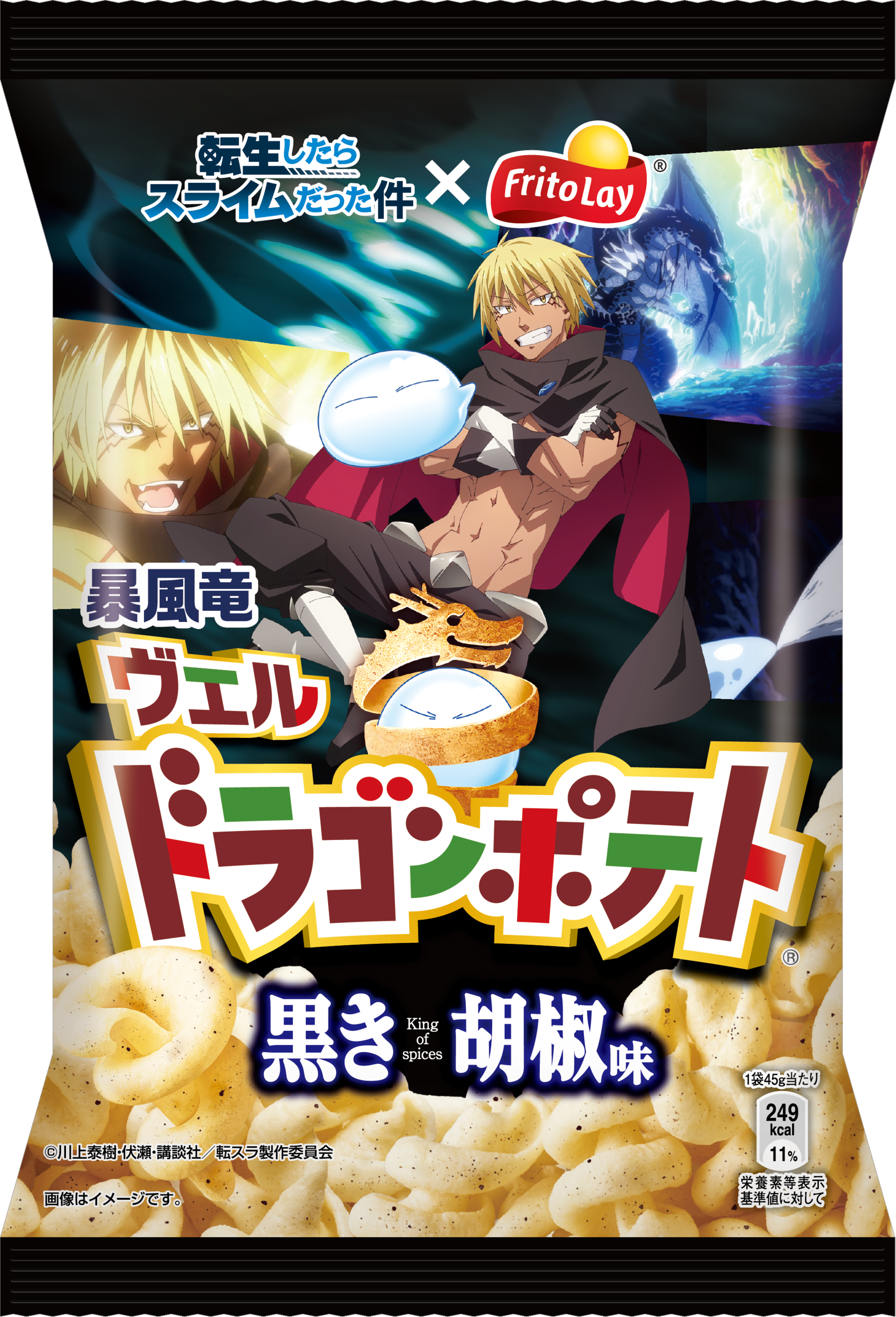 2022年3月に発表した新戦略「バリュエティスナック」を軸にスナック菓子を製造・販売するジャパンフリトレー株式会社(カルビーグループ、本社:茨城県古河市、代表取締役社長:松田 光弘)は、アニメ「転生したらスライムだった件(以下、転スラ)」初の劇場版となる「劇場版 転生したらスライムだった件 紅蓮の絆編」の11月公開に先駆けて、主要キャラクター「暴風竜ヴェルドラ」をイメージしたスナック『ドラゴンポテト 黒き胡椒味』を10月31日(月)より全国にて期間限定で発売します。また同日より、定番品である『ドラゴンポテト コクしお味』『ドラゴンポテト オニオンコンソメ味』が期間限定で転スラ仕様のパッケージに順次切り替え、発売します。(2022年12月中旬まで)