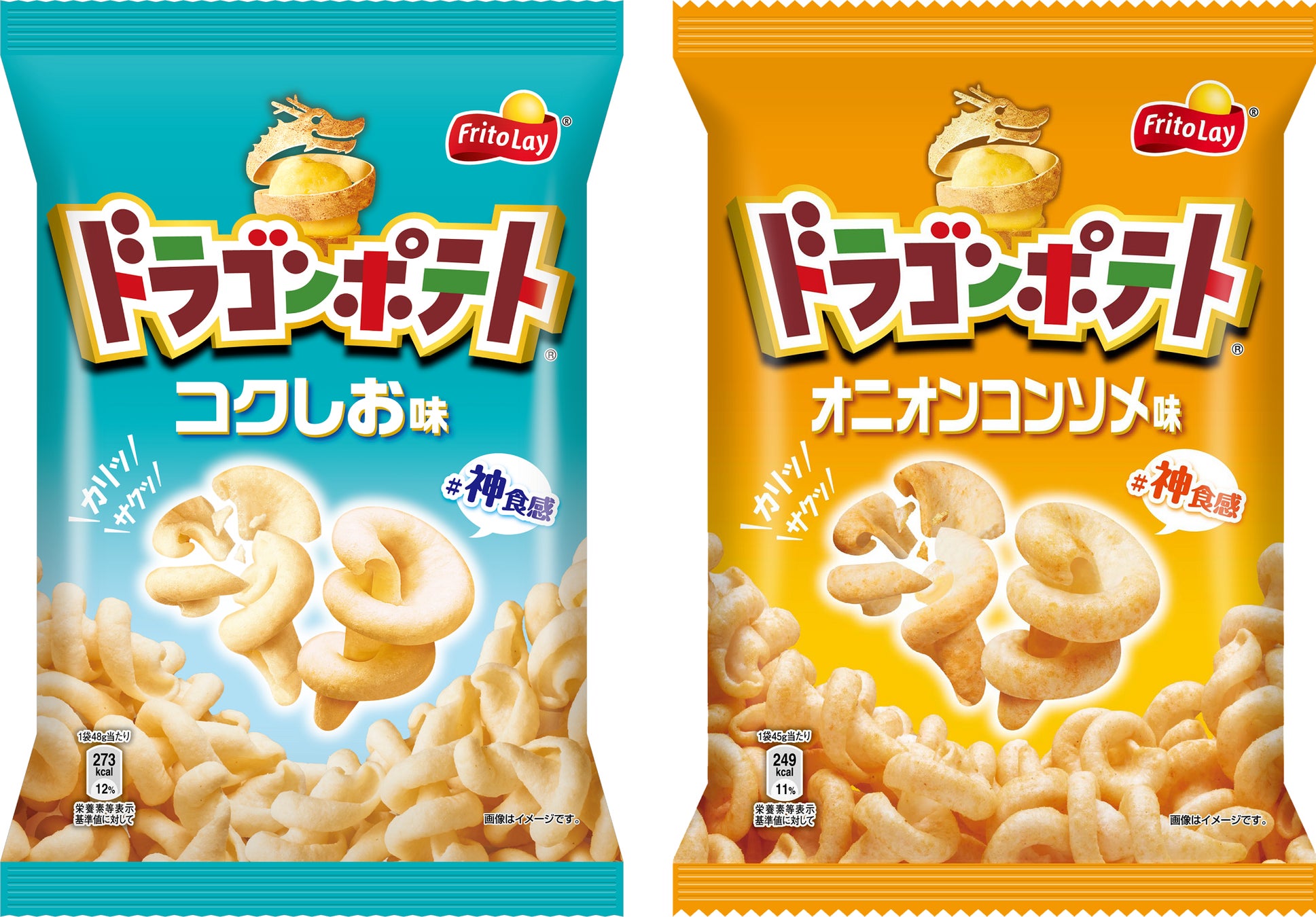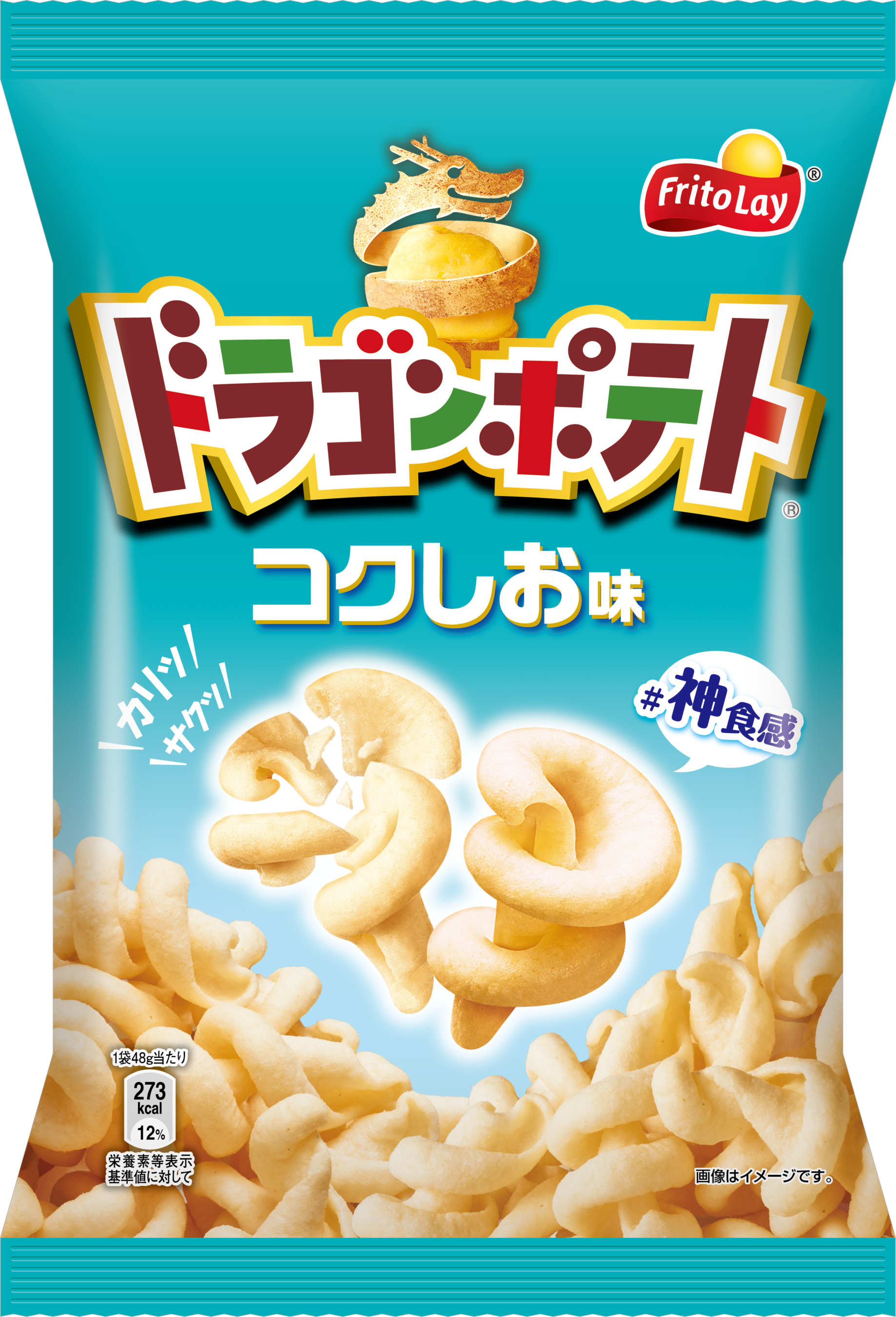 「ドラゴンポテト」はドラゴンのようなクルクル立体形状の多重食感ポテトスナックです。美味しさの秘密は、じゃがいもの旨みと独自製法によりカリッサクッとした食感で、2018年4月に全国発売以降、食べ出したら止まらないその美味しさにファンが広がっています。2021年4月からは味もパッケージもリニューアルし、定番商品として『コクしお味』と『オニオンコンソメ味』を展開しています。