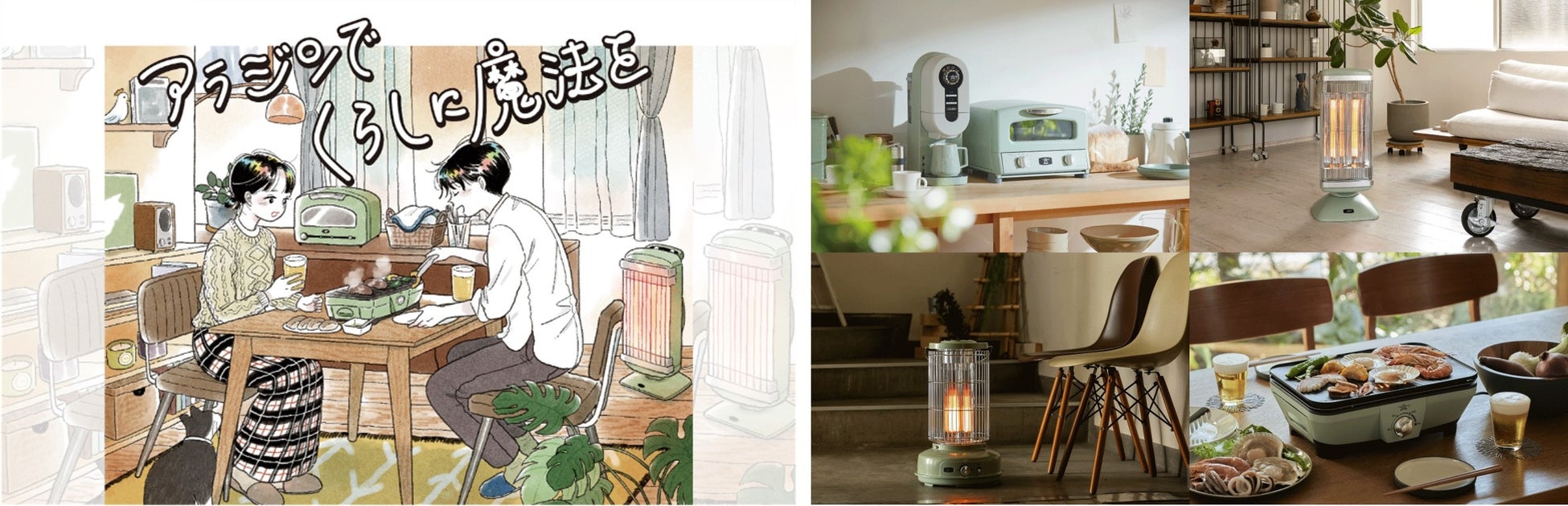 アラジン公式Instagramでは、くらしの中の”心あたたまるエピソード”の募集も行っており、審査で選ばれた3名様のエピソードが、人気イラストレーター・mameさんによってイラスト化され、その原画をプレゼントいたします。また、店頭で配布されるリーフレットには、mameさんのオリジナルイラストが描かれており、切り取ってポストカードとしてもご利用いただけます。同デザインのスマホ壁紙も特設サイトからダウンロード可能で、アラジンの商品とともにその世界観をお楽しみいただけます。