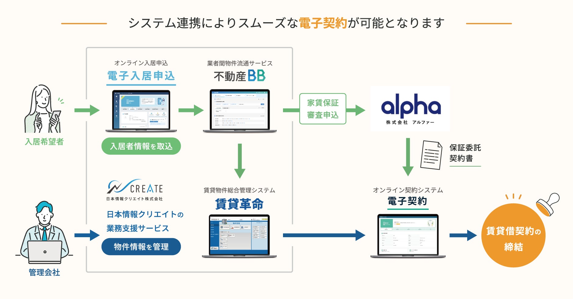 入居申込をオンラインで完結する日本情報クリエイトの「電子入居申込サービス」及び「電子契約サービス」と、アルファーが提携を行うことにより、家賃保証サービスをご利用いただく入居希望者様、仲介会社様、管理会社様はこれまでと比較して、手書きでの保証申込書作成の手間や記載漏れの確認などのストレスが少ない保証審査及び賃貸借契約と保証委託契約書を合わせたスムーズな電子契約が可能となります。