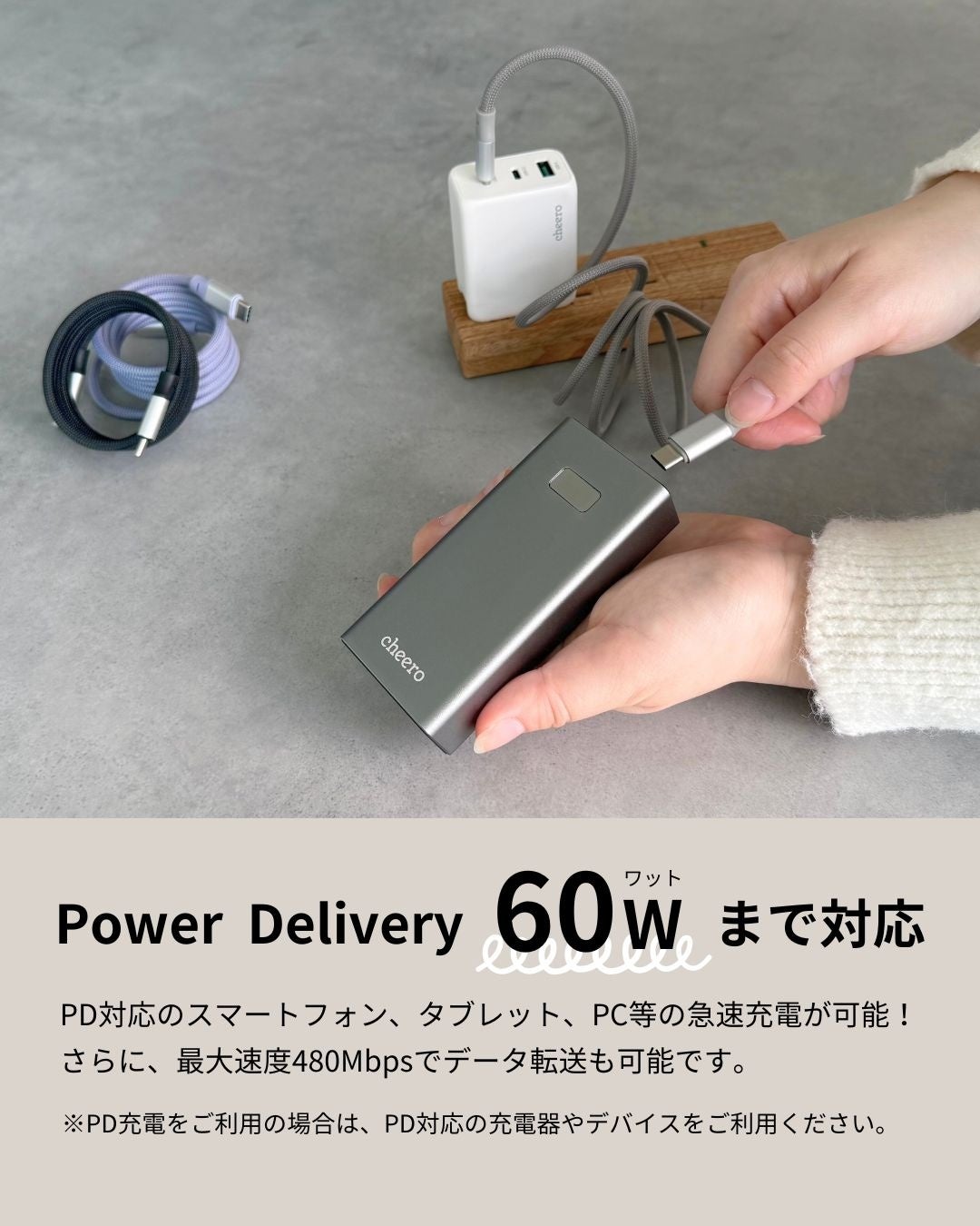 Power Delivery 60W対応で急速充電およびデータ転送も可能。