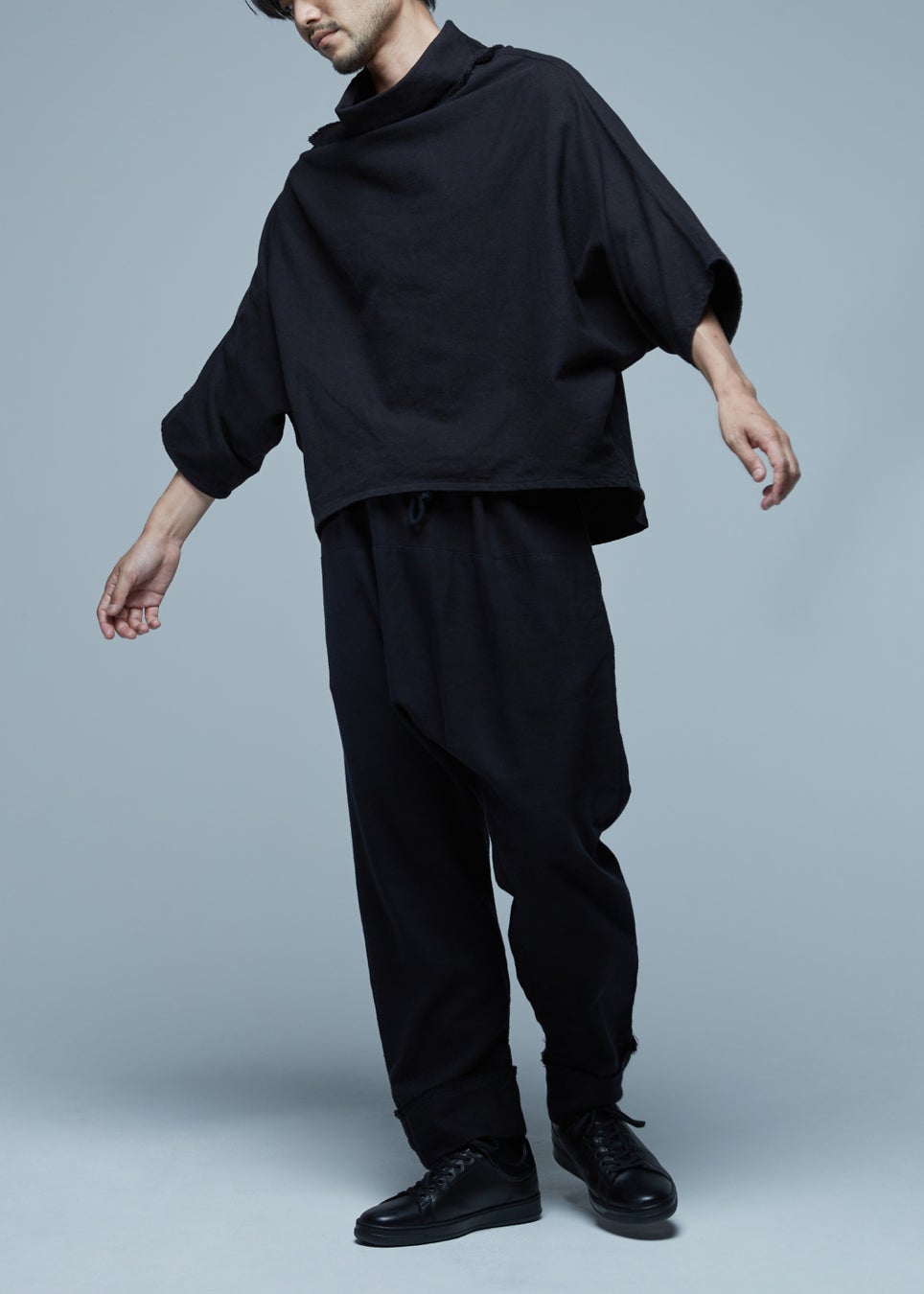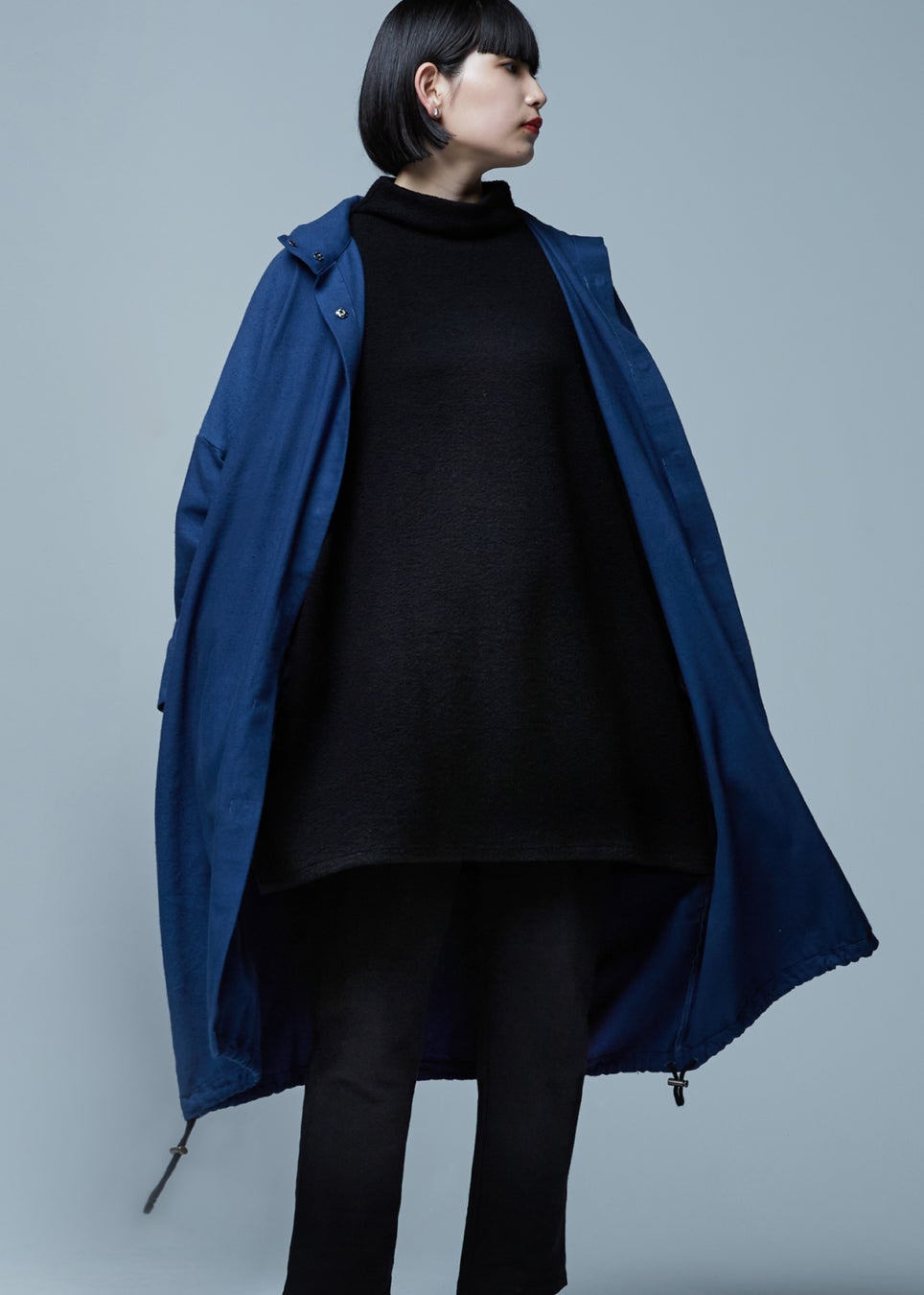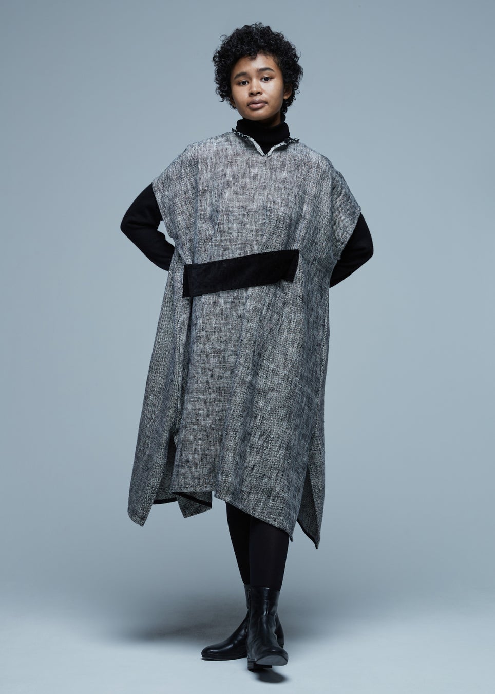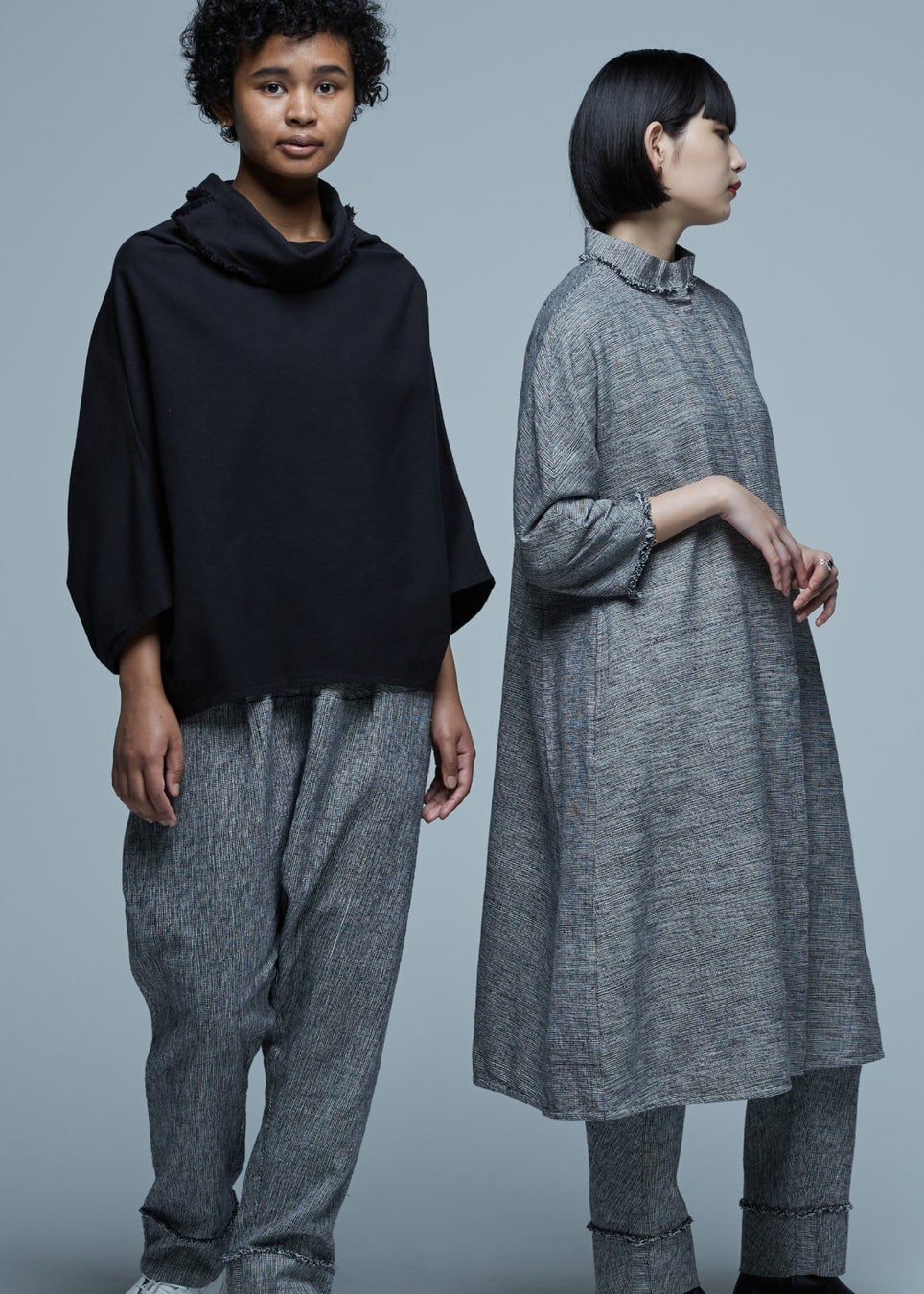 手紡ぎ手織りのぬくもり溢れる生地感を100%活かしたアウター。まさに「まとう」ような着用感は、素材の軽さと共に、肩も腕も身幅もゆとりがあるデザインから生まれる。細身の人が着ても、生地の柔らかさによってオーバーサイズに見えず、どんな体系でもフィットするシルエットを作り出す。ブランドの理念を体現する、ユニセックス、フリーサイズなデザイン。