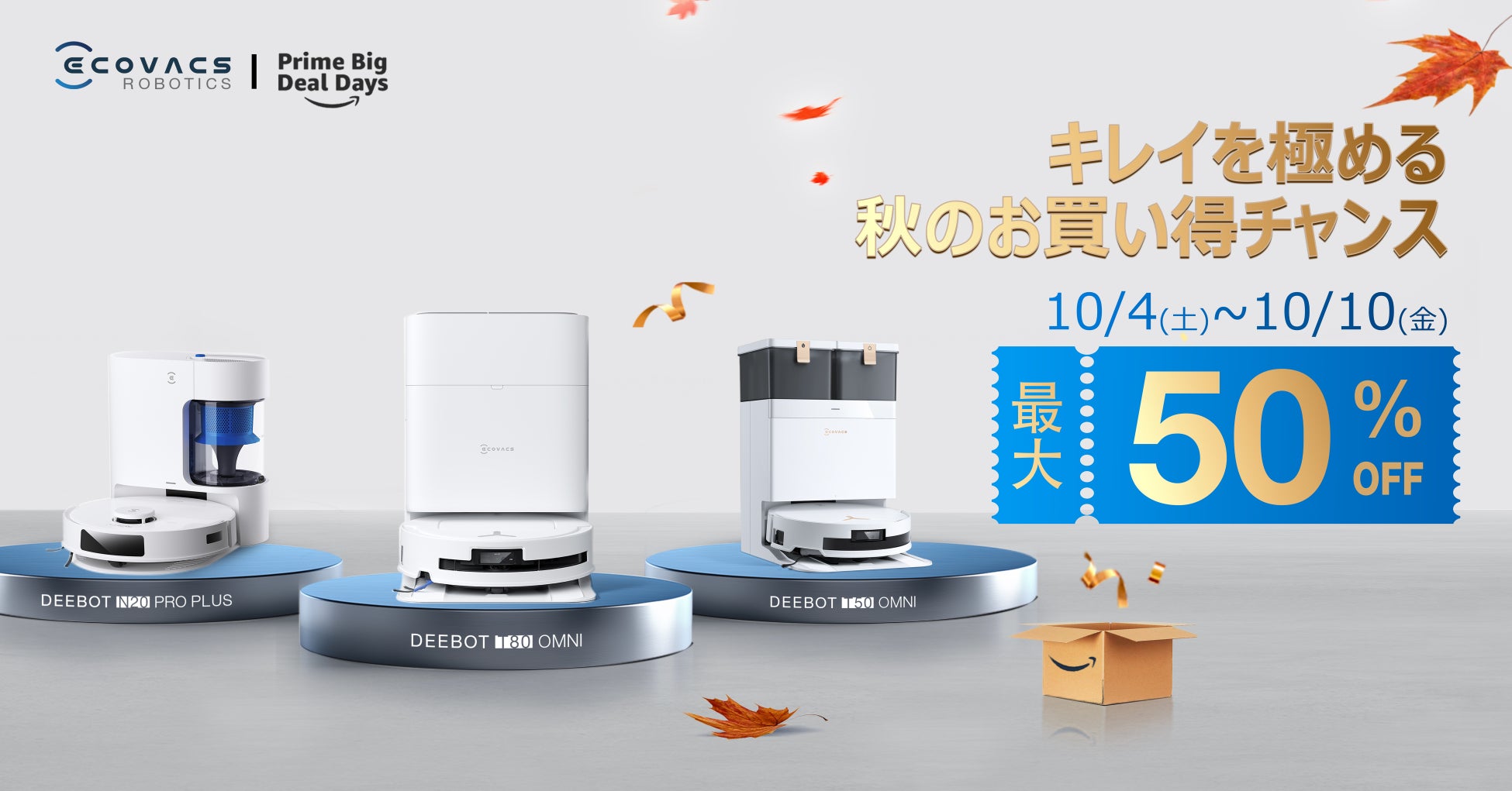 研究開発から製造、販売までを一貫して行い、家庭用ロボットをグローバルに展開する総合メーカー、エコバックスジャパン株式会社(本社:東京都千代田区、社長:梅田永智)は、2025年10月7日(火)00:00から2025年10月10日(金)23:59まで、Amazonで開催される「Amazonプライム感謝祭」に参加し、人気シリーズの「DEEBOT」をはじめ、窓拭きに特化したロボット掃除機「WINBOT MINI」など5機種が最大50%オフで手に入る期間限定の大幅割引を実施します。また、10月4日(土) 00:00~10月6日 (月) 23:59の「Amazonプライム感謝祭先行セール」でも対象製品をいち早くお得にご購入いただけます。