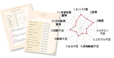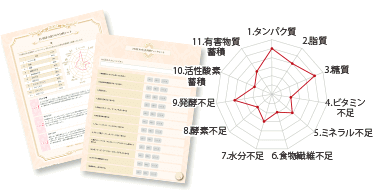 食事、生活・運動習慣、1日のスケジュールなど21項目のチェックシートから、11のリスクを分析いたします。ご自分では気付きにくい食リスクがわかる分析です。日々の食習慣の改善へ役立てられます。