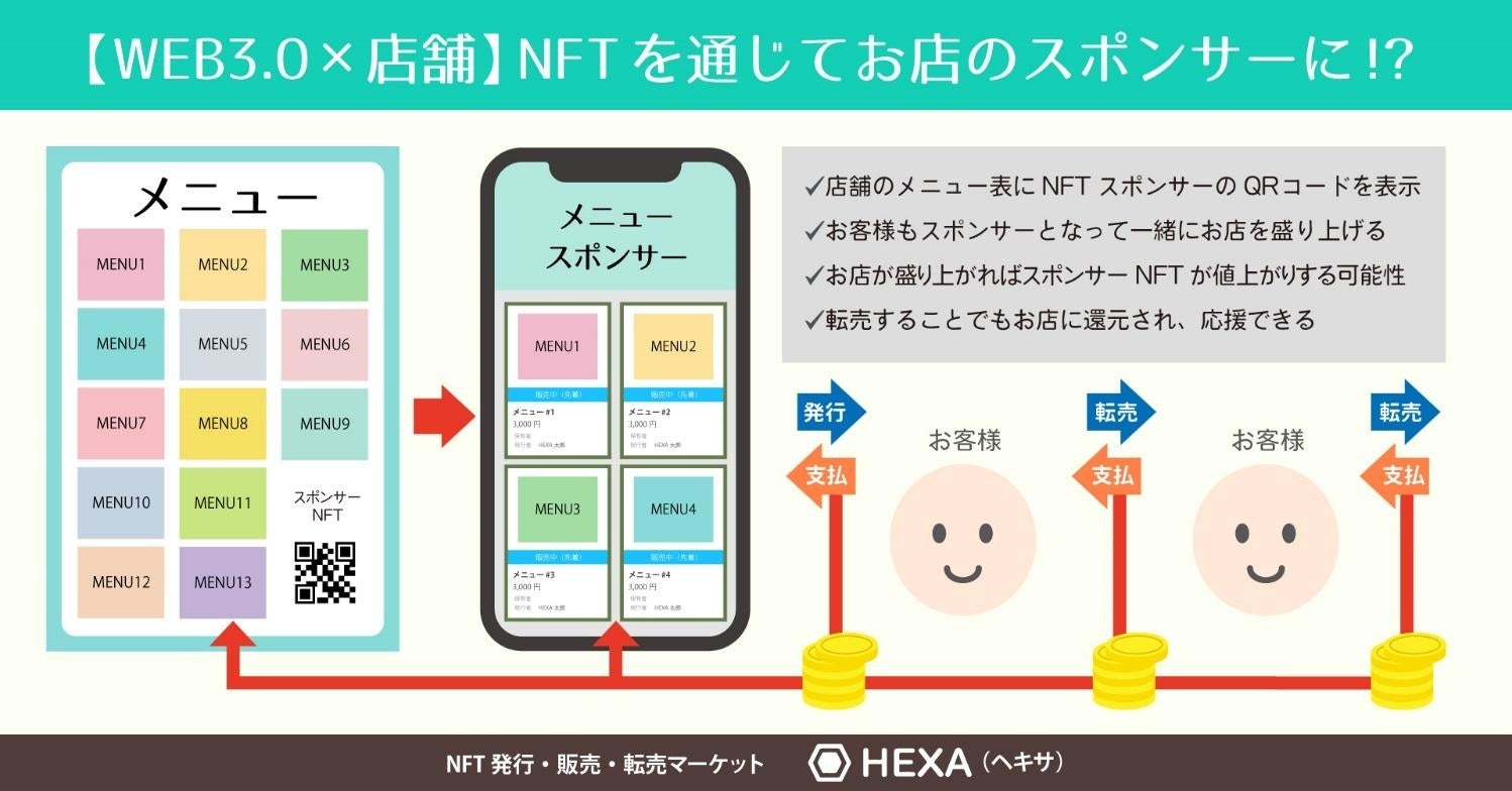 そこで当社は、NFTマーケットプレイス「HEXA(ヘキサ)」を運営するメディアエクイティ社と協働し、飲食店と支援者のつながりを新しく構築することで飲食店の継続・発展を後押しするプロジェクトを始動いたしました。
