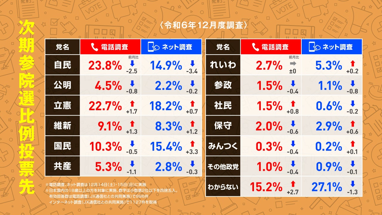 政党支持率、内閣支持率、参院選比例投票先について、2024年12月実施 電話×ネットのハイブリッド意識調査結果を発表【選挙ドットコム×JX通信社】