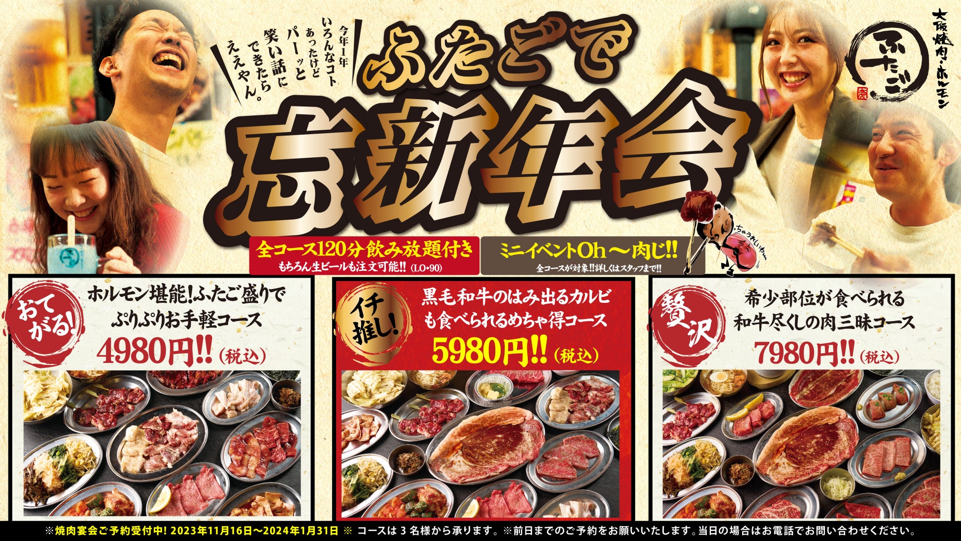 “名物!!黒毛和牛のはみ出るカルビ”が話題の「大阪焼肉・ホルモン ふたご」、今年の忘新年会コースは当たりがでたら肉運をおすそわけできる「肉くじ」付き!
