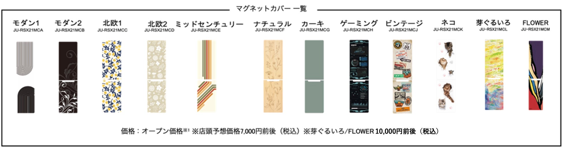 ドア面を彩る「マグネットカバー」は、白と黒を基調にした「モダン」や、花柄で優しさを感じる「北欧」、アメリカンなステッカーでデコレーションされた「ビンテージ」などの10種類に今回の2種類を加え、合計12種類となります。