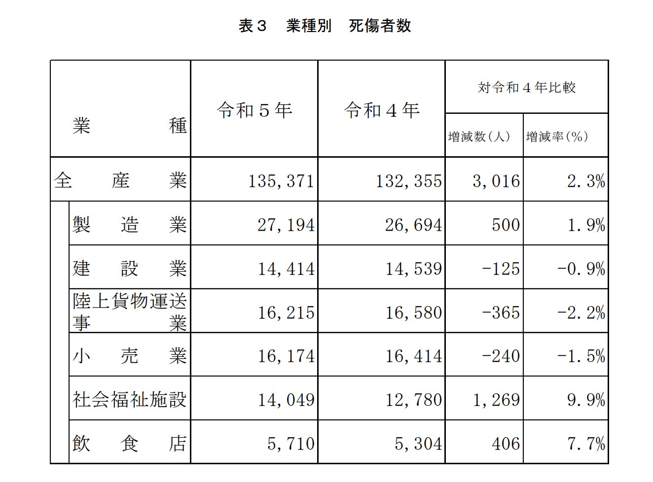 厚生労働省が発表した令和5年労働災害発生状況の分析では、製造業は業界別で最も件数が多く27,194 人(前年比 500 人・1.9%増)と報告されました。事故の型別では死亡者数、死傷者数ともに機械等への「はさまれ・巻き込まれ」が最多となっており、防止対策としてリスクアセスメントと必要な改善措置を確実に講じた上で、機械等を安全に使用することの徹底を図ることが求められています。