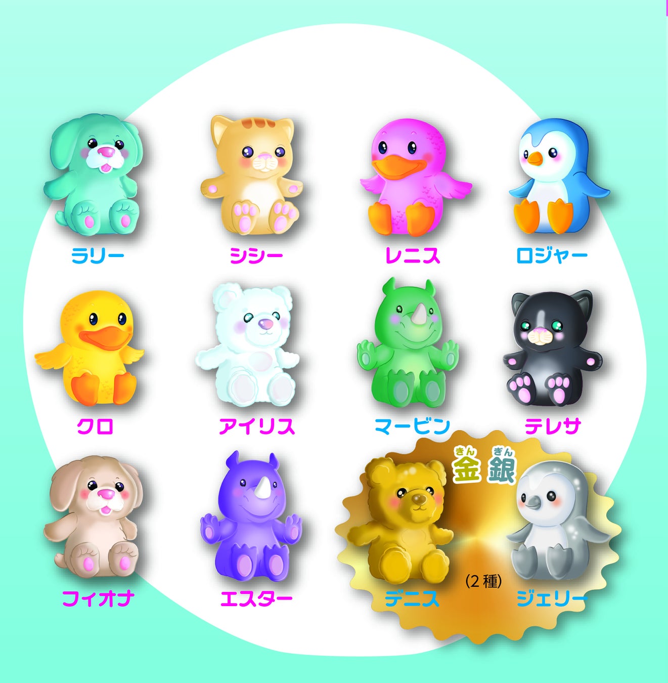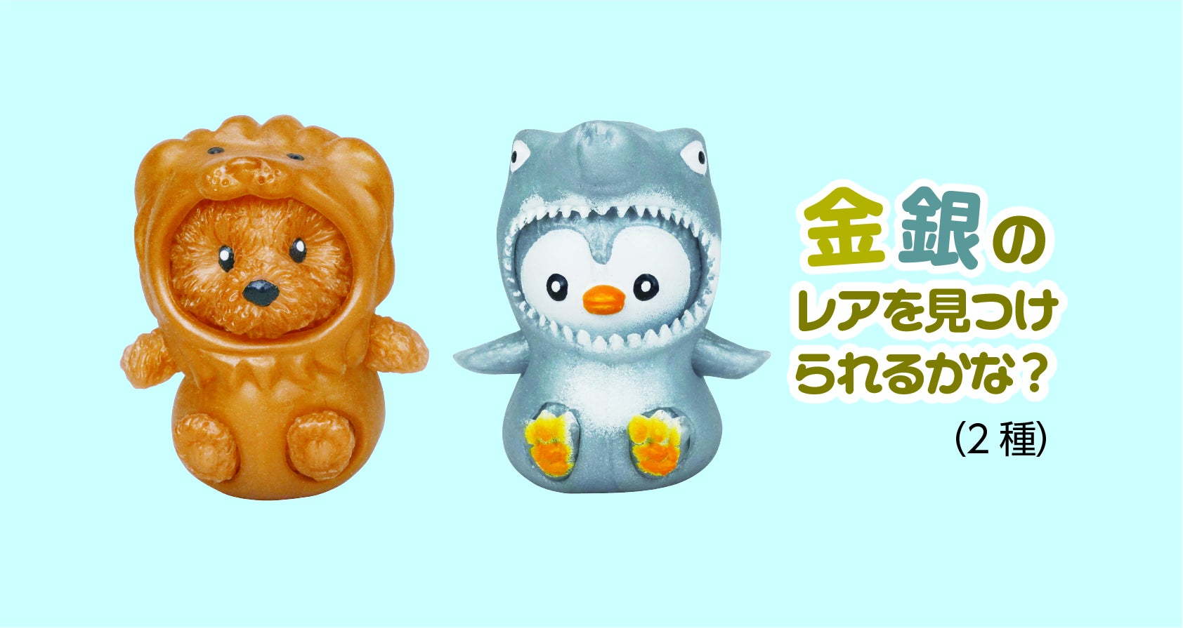 全12種の中には、ゴールドとシルバーのレアキャラも登場。ゴールドはくまのフィギュアにライオンの衣装、シルバーはペンギンのフィギュアにサメの衣装がセットになっています。