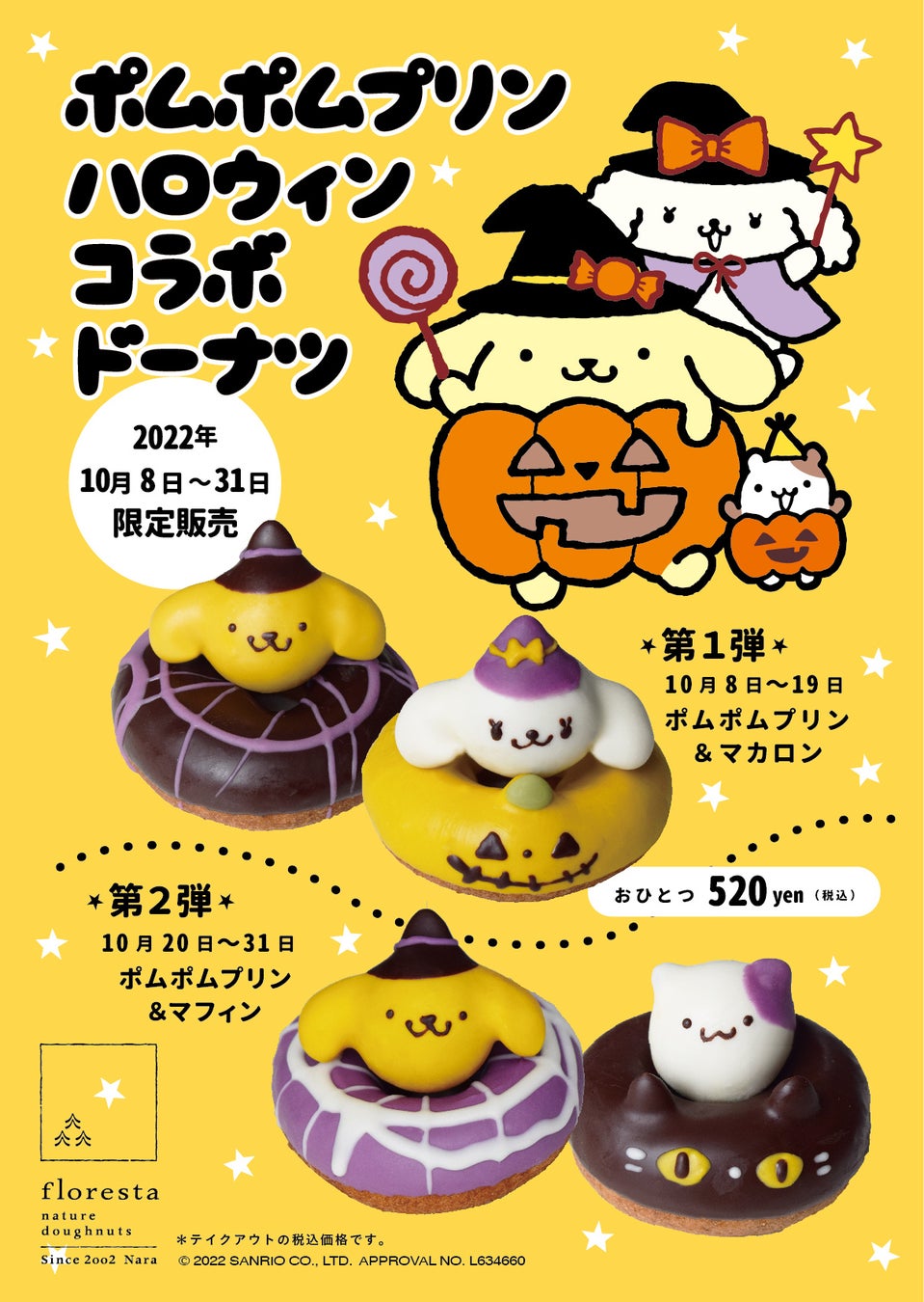 株式会社フロレスタ(本社:大阪市浪速区/代表取締役社長:辻尾吉厚)は、2022年10月8日(土)〜 31日(月)の期間限定で店頭及びオンラインストアにて「ポムポムプリンハロウィンコラボドーナツ」を販売します。
