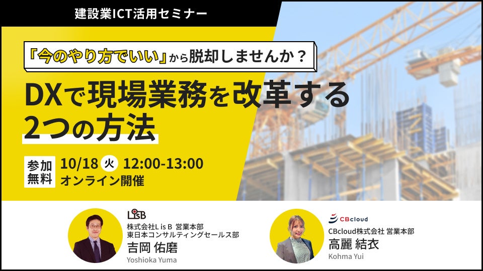 CBcloud株式会社と株式会社L is Bは、「建設業のICT活用セミナー」と題しまして、10月18日(火)に共催セミナーを開催いたします。現在の業務のやり方をICTを使ってどのように変えていくことができるのか、建設業界他社の成功事例を交えてご紹介いたします。