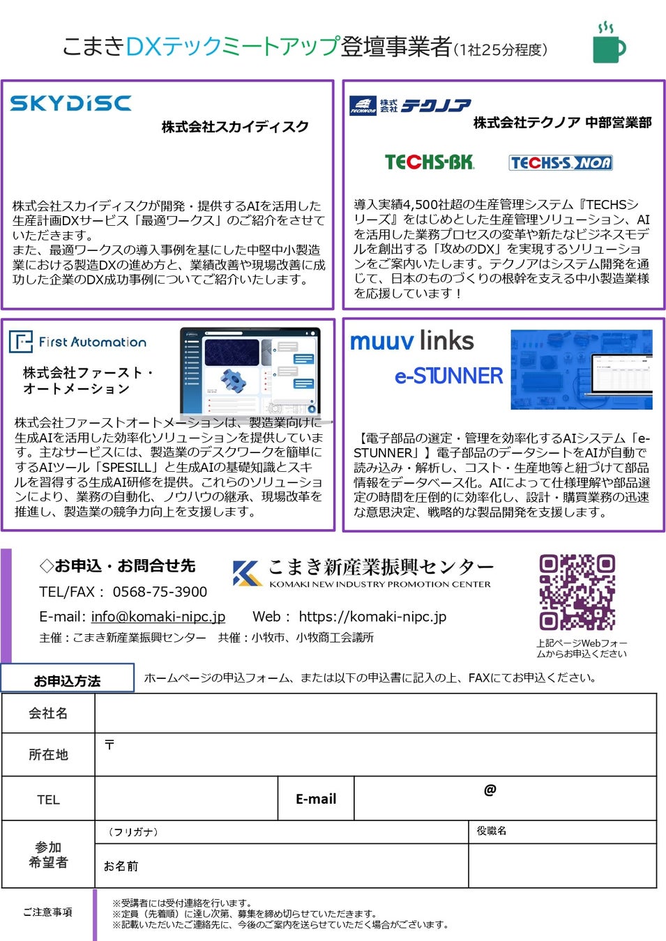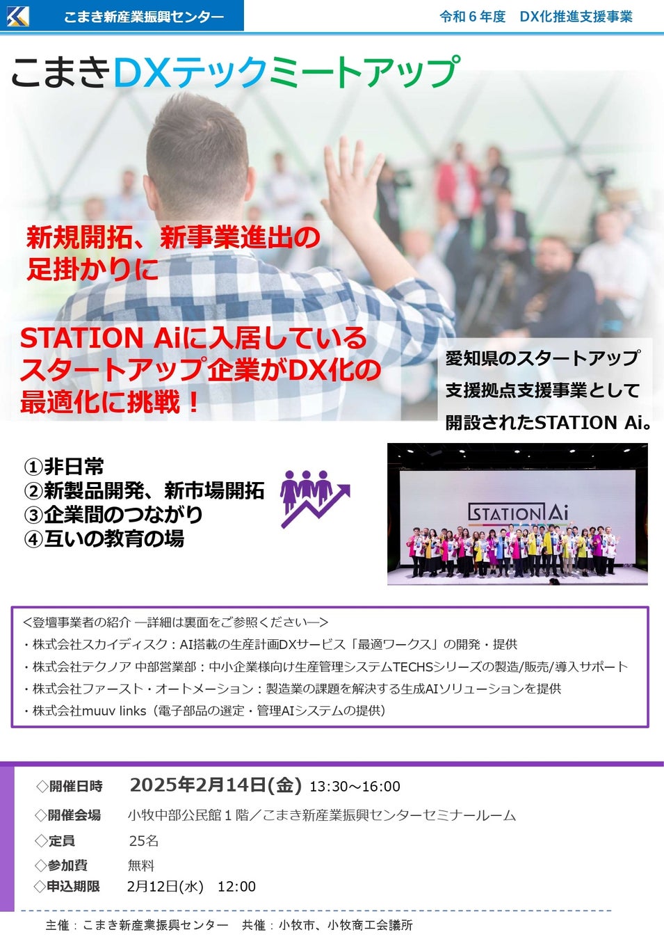 株式会社スカイディスク(本社:福岡県福岡市中央区、代表取締役CEO:内村 安里、以下「スカイディスク」)は、こまき新産業振興センターが主催する「こまきDXテックミートアップ」にて生成AIを活用した生産管理システムを始めとした主に製造業向けのソリューション説明のピッチに登壇いたします。