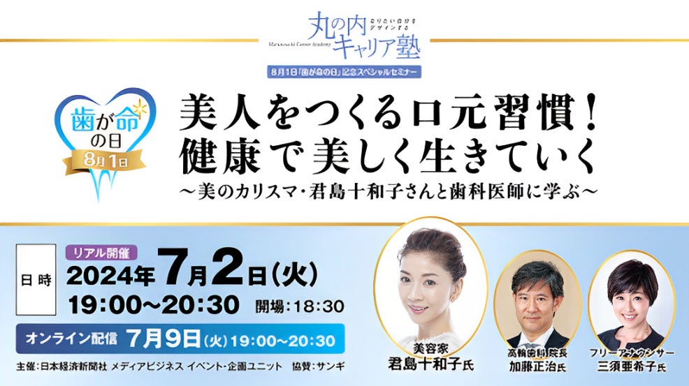 この「歯が命の日」を記念して、7月2日(火)に都内イベント会場とオンラインにてオーラルケアセミナーを開催。健康で美しく年を重ねていくために、今から実践できる口元習慣とは?今年は美容家・君島十和子さんをゲストに迎え、歯科医師とともに明日から活かせるオーラルケアのコツをお伝えします。
