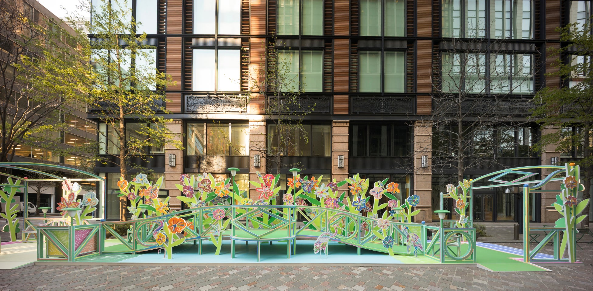 東京の歴史的かつ文化的中心である丸の内、その丸の内仲通りを舞台に、5月11日(日)まで、特別な季節の到来を祝う魅惑の祭典を繰り広げます。ナヴェが創造する新しい色彩により命を吹き込まれた架空の庭園には、道行く人々が憩うベンチやブランコが設置され、池には草花で彩られた橋が架かり、噴水では鳥たちが羽を休めます。小さな屋外図書館にも花々が咲き乱れ、集う人々の対話から新たな物語が紡がれます。