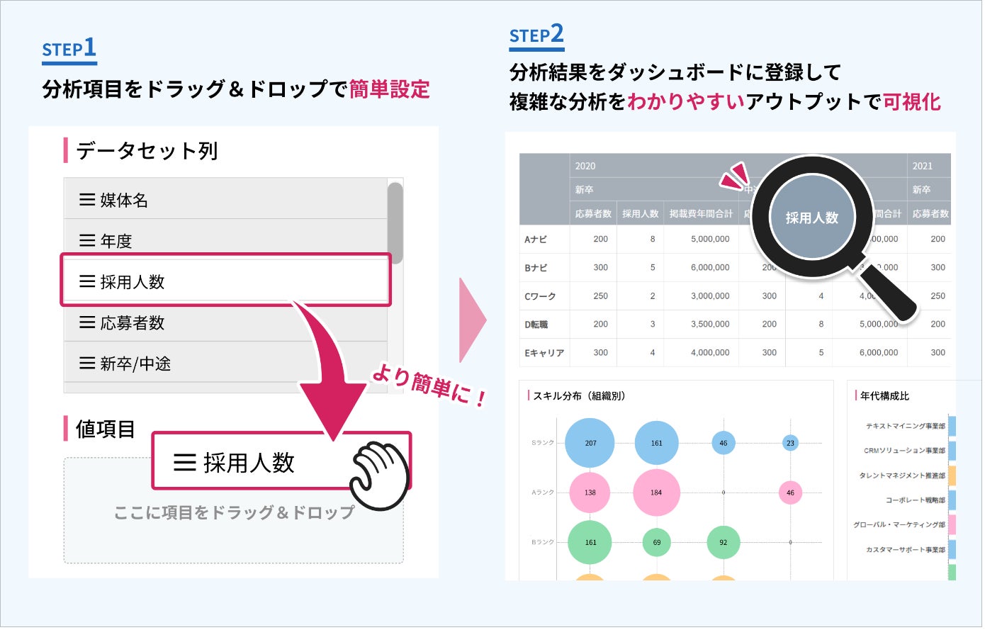 ドラッグ&ドロップで集計分析を可能に。データ加工機能、ダッシュボード機能との併用でさらなる人事DXを実現。