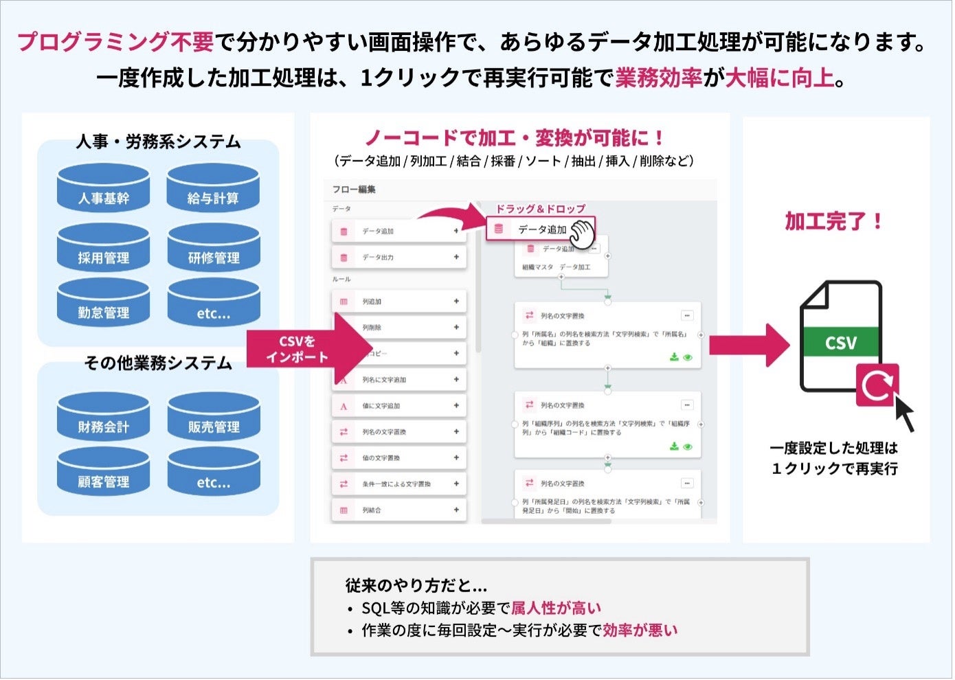 タレントパレットに搭載する「データ加工」機能は、これらのデータ分析や集計、活用を行う上で事前に必要となるデータ加工処理をドラッグ&ドロップ操作で作成することができるノーコード(SQLなどのシステム言語を使用したプログラミングを必要としない)ツールです。