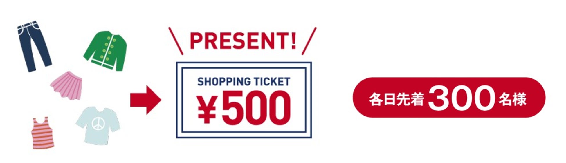 不要になった衣料品5着以上の回収にご協力いただいた各日先着300名のお客様に、お買物券500円相当をプレゼントいたします。
