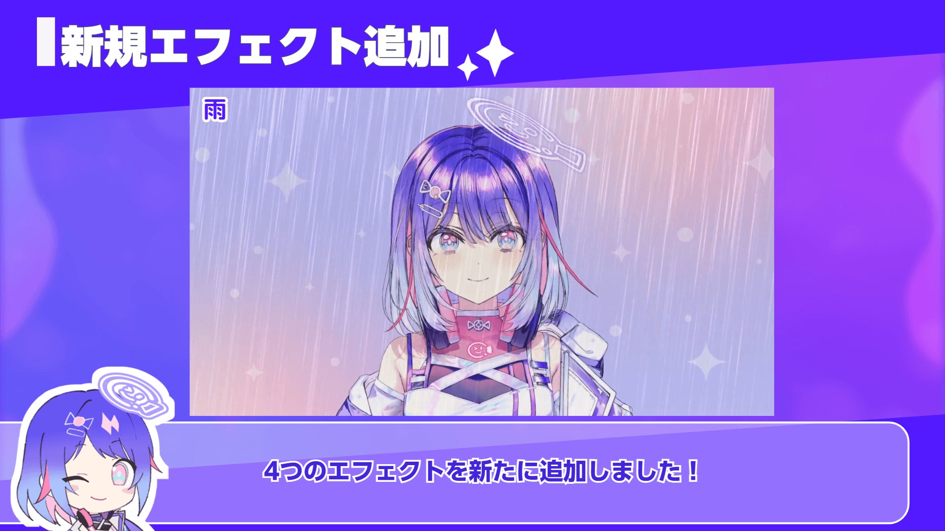 また、「雨」「雪」「色収差」などのエフェクトプリセットを新たに10個追加し、リセットボタンも分かりやすい場所に新たに配置しました。