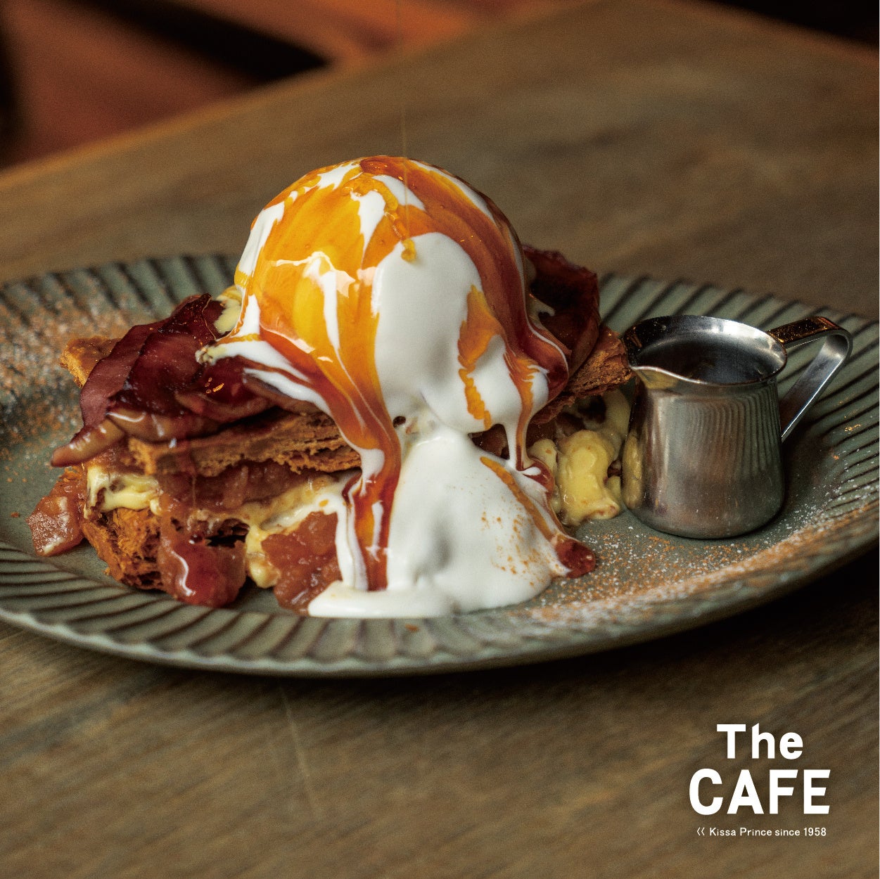 薄くモチモチとした、食感が特徴のアメリカンパンケーキに、たっぷりのマロンクリームを乗せ、相性抜群のカシスアイスと、ほんのりラム酒の香りをまとった塩キャラメルソースをトッピングした秋にぴったりの一品です。
