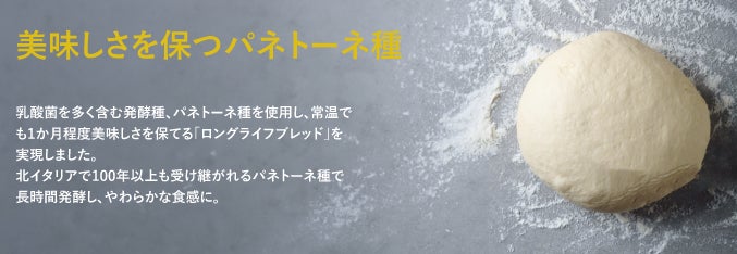発酵種には、酵母と保存性を高める乳酸が共存する珍しい天然酵母、「パストーネ種」を使用。乳酸菌の効果で長期間ふっくらした美味しさが長続きする「ロングライフブレッド」を実現しました。