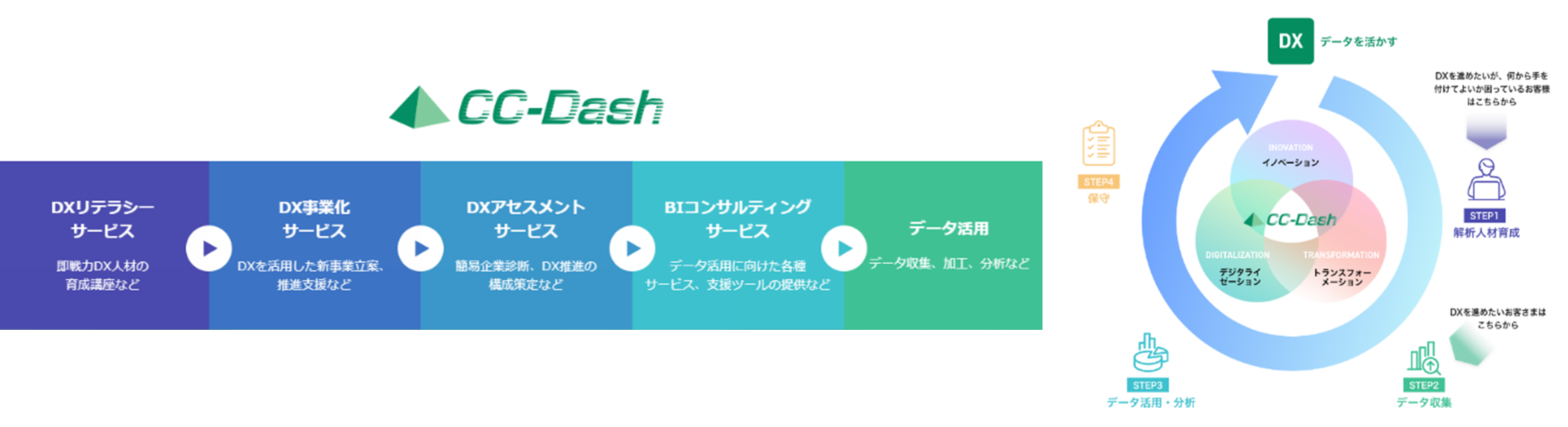 「CC-Dash」( https://xcc-dash.jp/ )は、データ活用によってお客様のDX推進を支援する当社独自のフレームワークです。DXを推進する際の各フェーズ(①知る ②つくる ③集める ④整える ⑤分析する ⑥活かす)における様々な課題に対し、テンプレート化と各種コンサルティングサービスをお客様に提供しています。加えてアライアンス等によってソリューションサービスのラインナップを随時追加・拡充していくことで、お客様のDX推進状況に合わせた支援策をワンストップで提供してまいります。