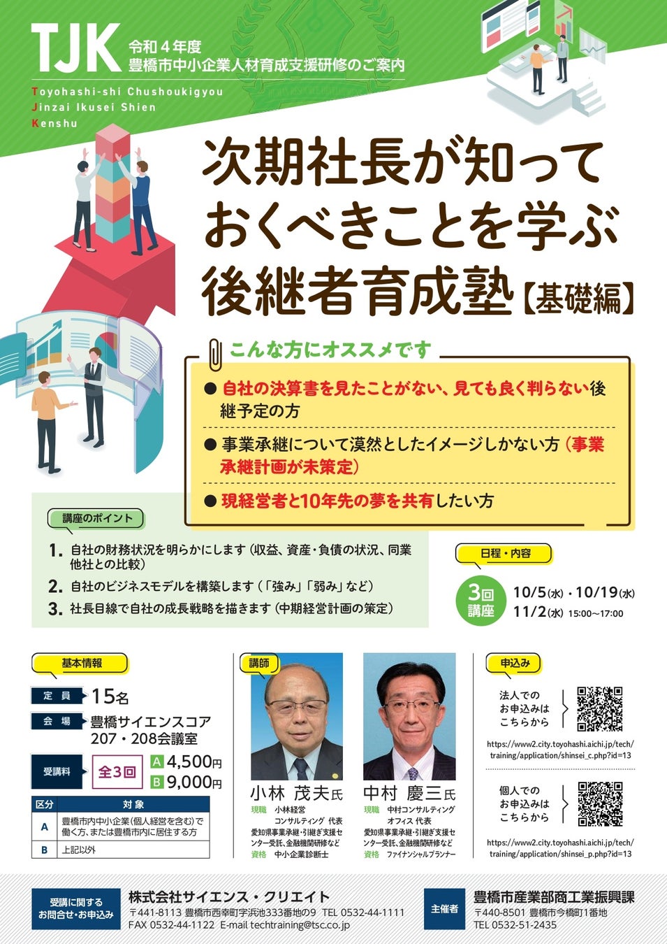 豊橋市オリジナルの人材育成研修「次期社長が知っておくべきことを学ぶ 後継者育成塾【基礎編】」を開講します