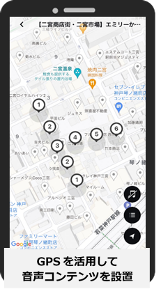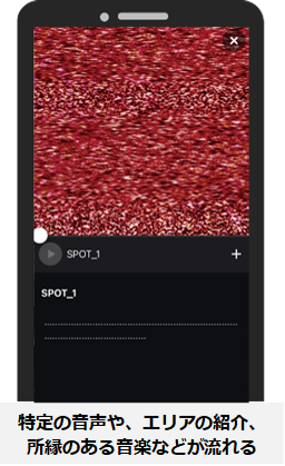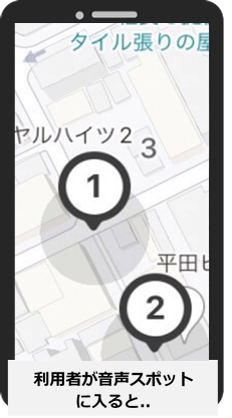 GPSやビーコン等を使い、特定の場所に紐づけた音声コンテンツを専用アプリから多言語で配信する仕組みです。美術館の音声ガイドを、アプリを使って街中に設置していく取り組みです。視覚に依存したARと異なり、利用者の歩きスマホを誘引しない高い安全性や、観光地や文化財などの景観を損なわないなど、音声+ARならではのメリットがあります。