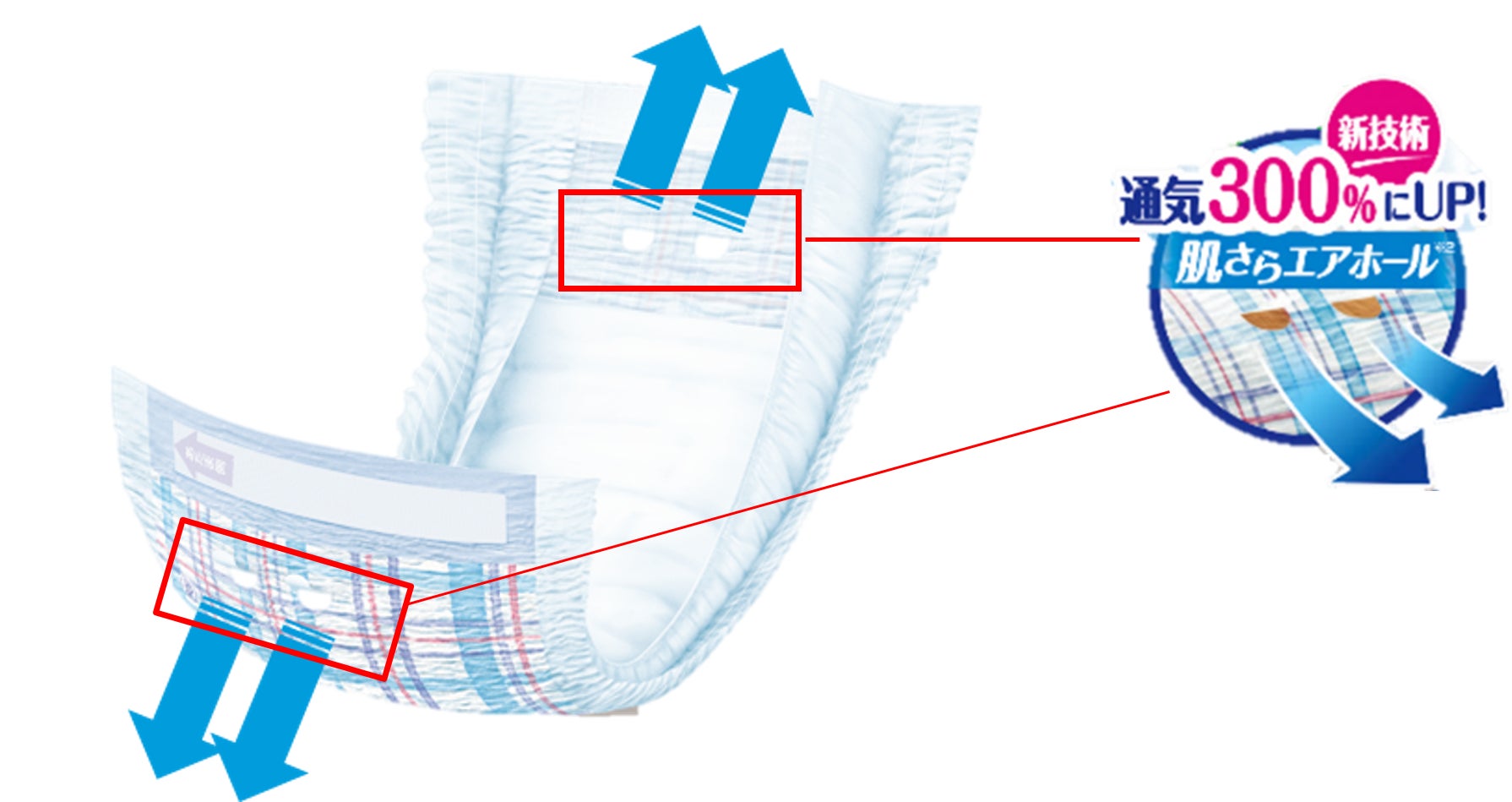 ①通気性を300%※1に向上させる独自の「肌さらエアホール」を新搭載※2
