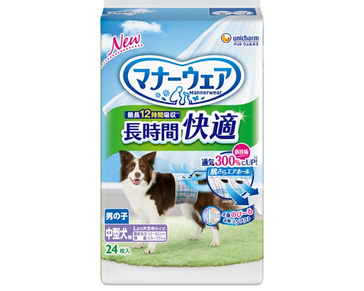 ユニ・チャーム株式会社(代表取締役 社長執行役員:高原 豪久)は、長時間の着用でも愛犬が快適に過ごせるよう、通気性を300%※1にまで向上させる独自の“肌さらエアホール”を搭載※2した『マナーウェア 長時間快適 男の子用』を2026年5月下旬より全国で発売します。また、新たに中型犬の体型にあわせたサイズを追加し、2026年3月24日に全国で発売します。