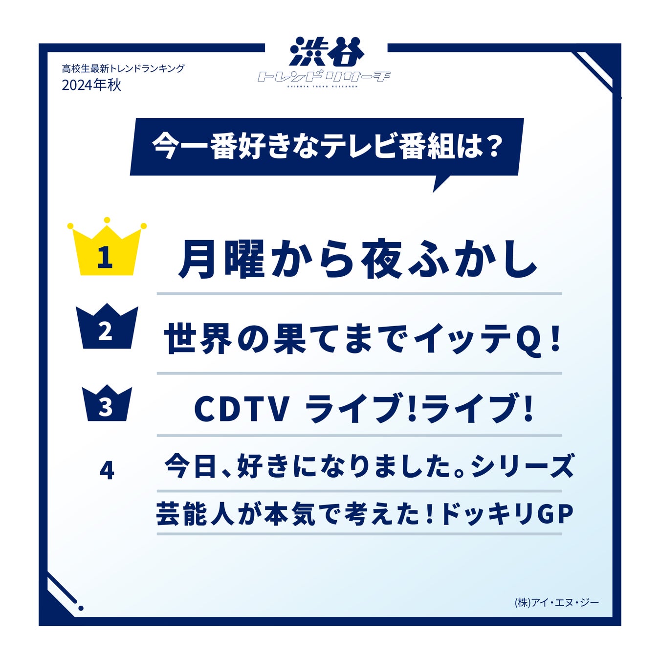 1位は「月曜から夜ふかし」が選ばれました。変わった一般の方を取り上げる企画がTikTokでも度々話題となりランキング首位をキープし続けています。2位には「世界の果てまでイッテQ!」が入選。「企画がすごく面白いから。見応えがあって好きだから。」(高3・女子)など王道のバラエティ番組として人気を博しています。