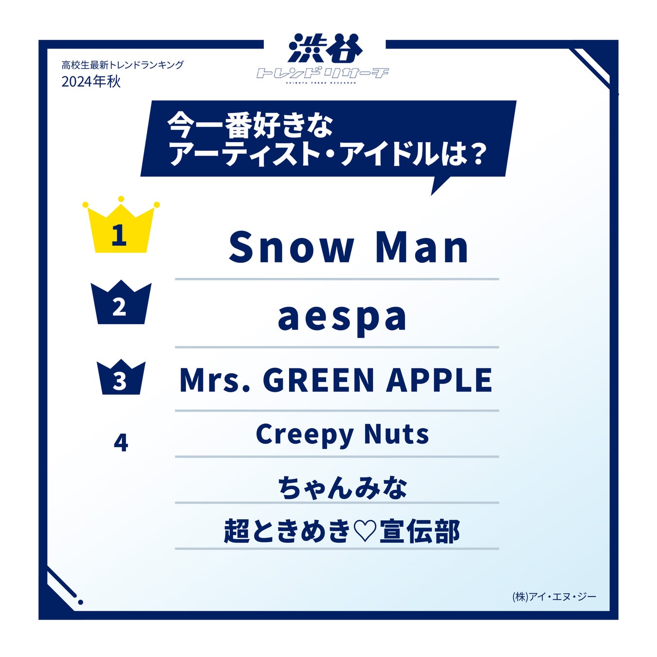 9人組の国民的アイドルグループ「Snow Man」が本ランキングで初の1位を獲得しました。過去の同調査でも常に順位にランクインしていましたが、高校生の好きなジャンルが多様化している中でも人気を博しているようです。
