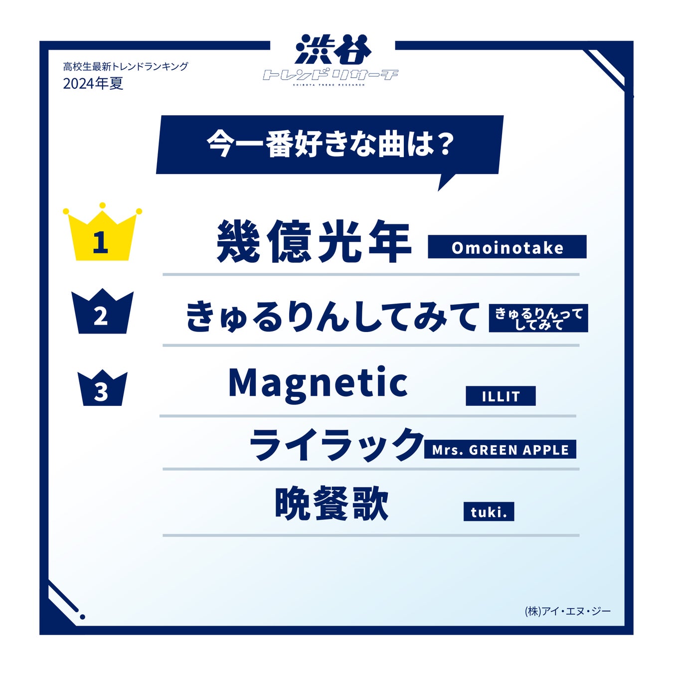 春の特大号に引き続き「Omoinotake」の『幾億光年』が1位にランクイン。「カラオケでよく歌う」(高1・女子)などとカラオケの定番ソングとして人気をキープしています。