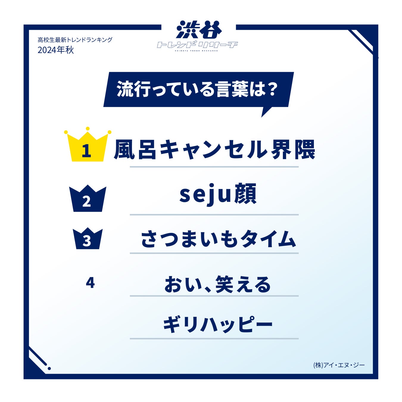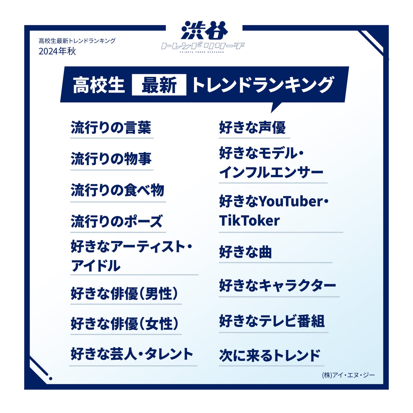 【2024年秋!高校生最新トレンドランキング】 Z世代の流行語や話題の食べ物・ポーズなど全15項目を発表!ネクストトレンドでは入選コメントも掲載!渋谷トレンドリサーチ2024年秋の特大号