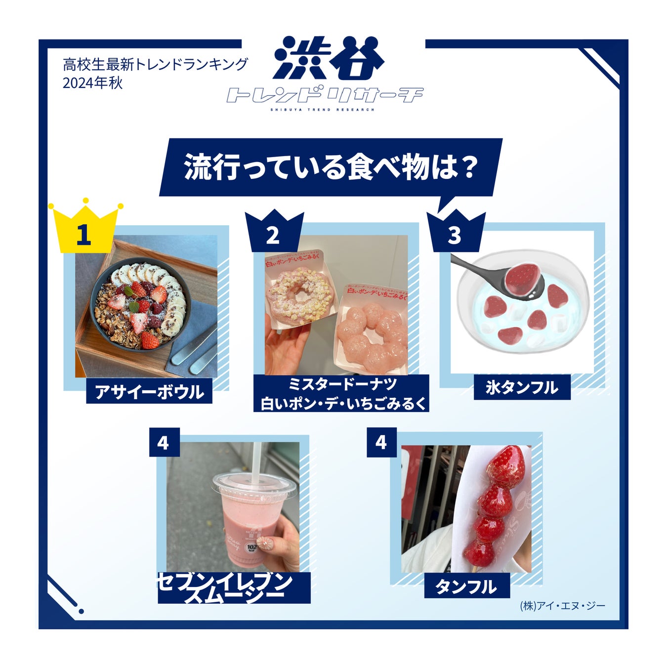 「アサイーボウル」が再び1位を獲得。自宅でアレンジして食べている他、この夏都内を中心に続々とオープンした専門店に行列を作りました。2位は「ミスタードーナツ 白いポン・デ・いちごみるく」がランクイン。ミスタードーナツで定番の人気シリーズの「ポン・デ・リング」の新商品で8月に発売されるとその可愛らしい色合いも手伝い瞬く間にSNSで話題となりました。3位に「氷タンフル」が選出。猛暑が続いた今年の夏、冷凍フルーツを氷水に入れるだけで楽しめる新感覚スイーツが人気を集めました。