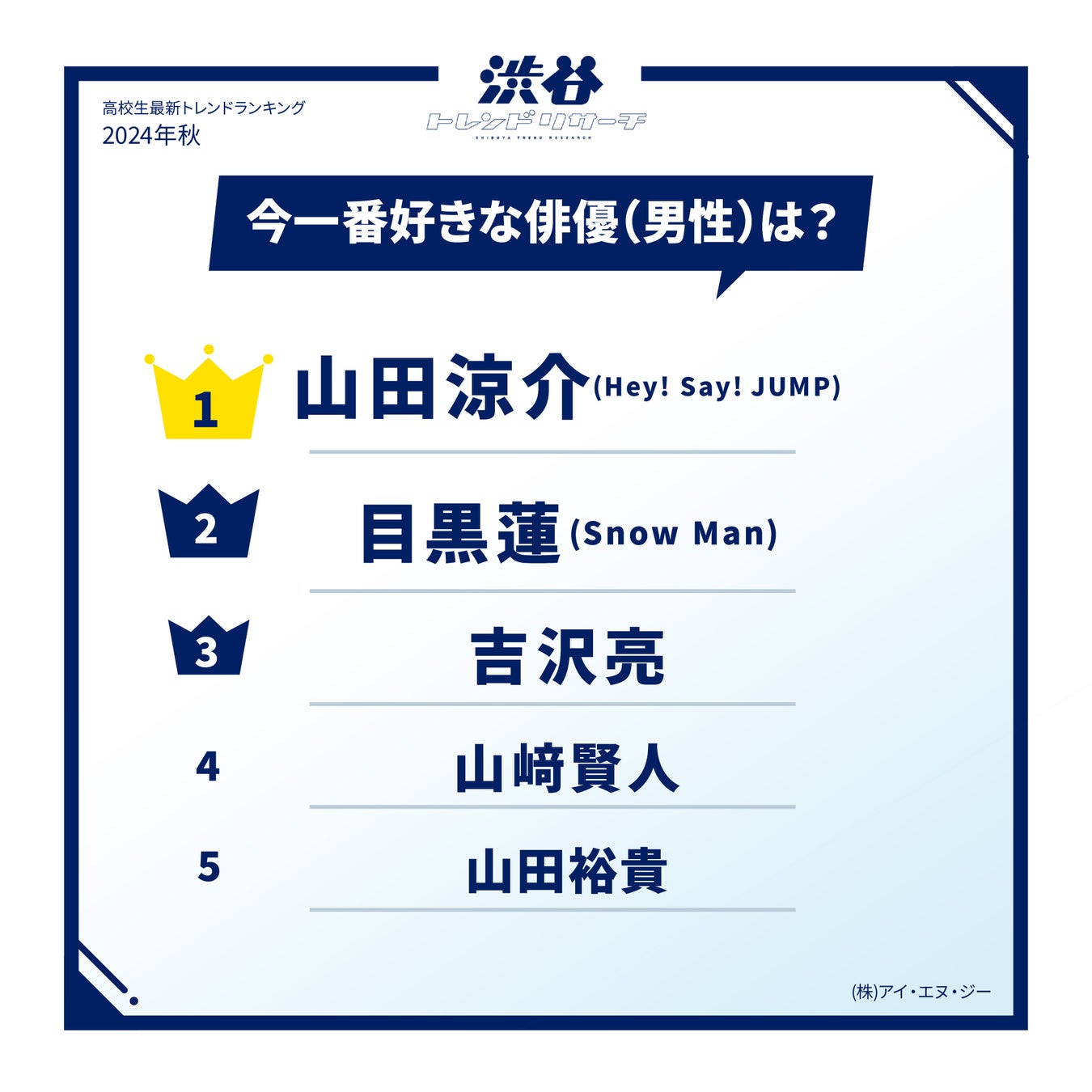 「山田涼介(Hey! Say! JUMP)」が本ランキング初の1位に選ばれました。「とにかくカッコイイ!出演されているだけでドラマを観たくなるから。」(高2・女子)などのコメントが多数挙げられており、高校生からの俳優としての人気が高いようです。フジテレビ系ドラマ『ビリオン×スクール』の初の教師役ではコミカルでパワフルな役柄が話題となりました。