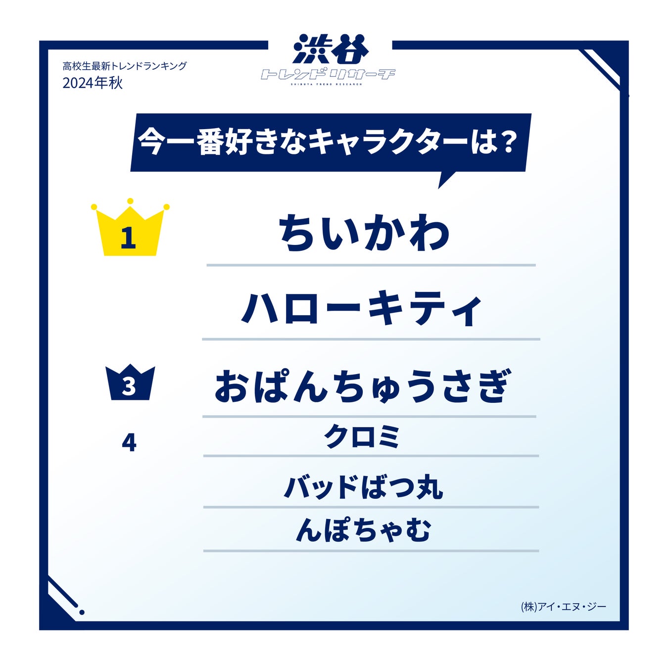 ちいかわが返り咲き1位を獲得。同率1位にランクインした「ハローキティ」は前回の同調査より3ランクアップの結果となりました。「めっちゃ可愛いしjkって感じがするから!」(高2・女子)などのコメントが多く挙げられ、今年で50周年を迎えコラボアイテムも多数販売されている「ハローキティ」が再び高校生の間でブームとなっています。
